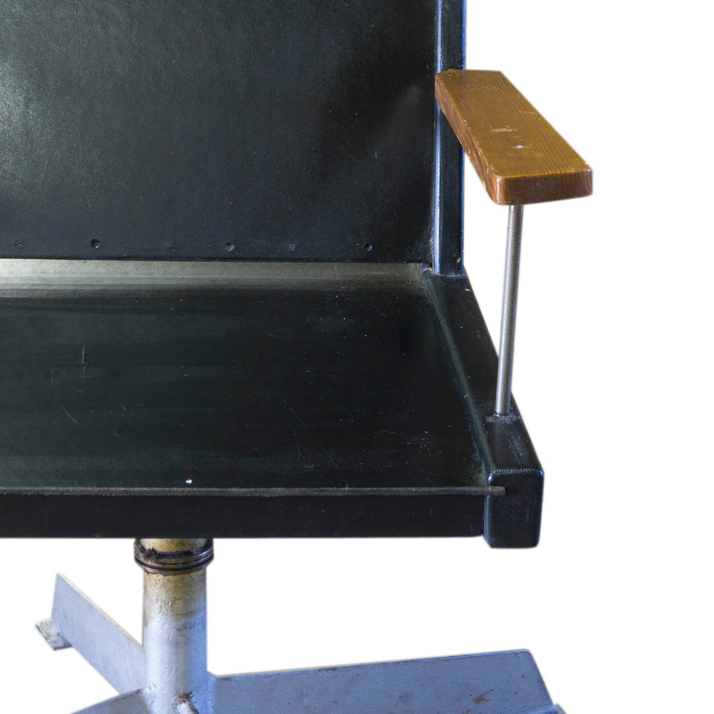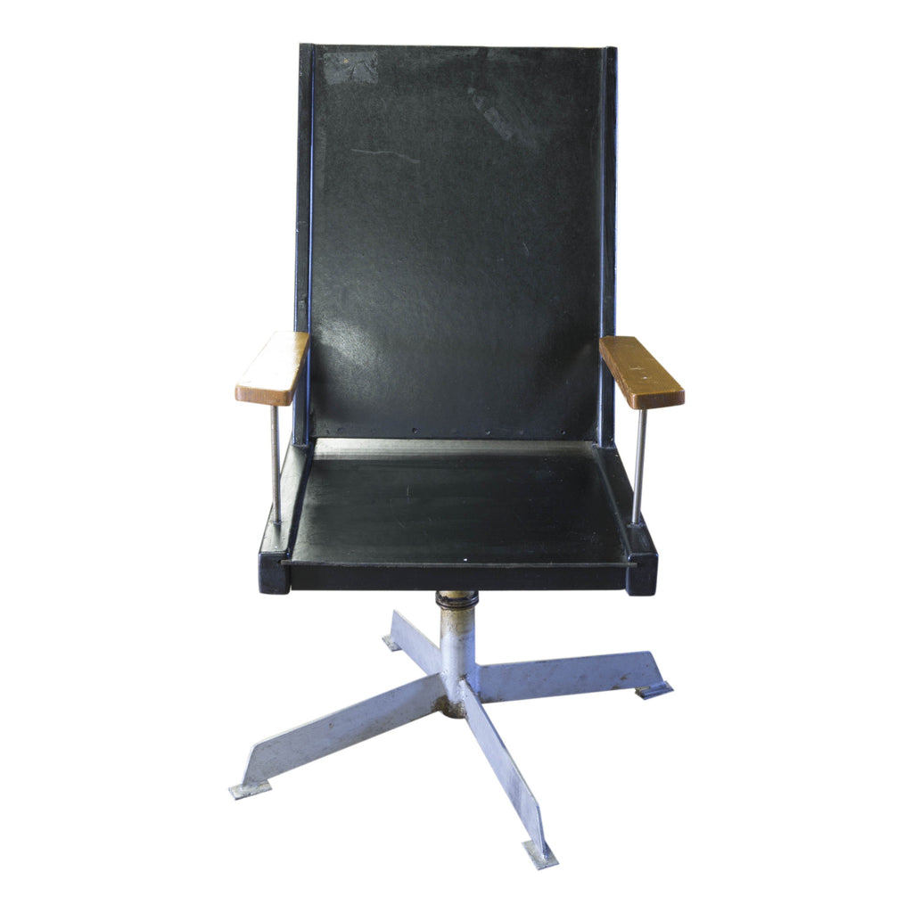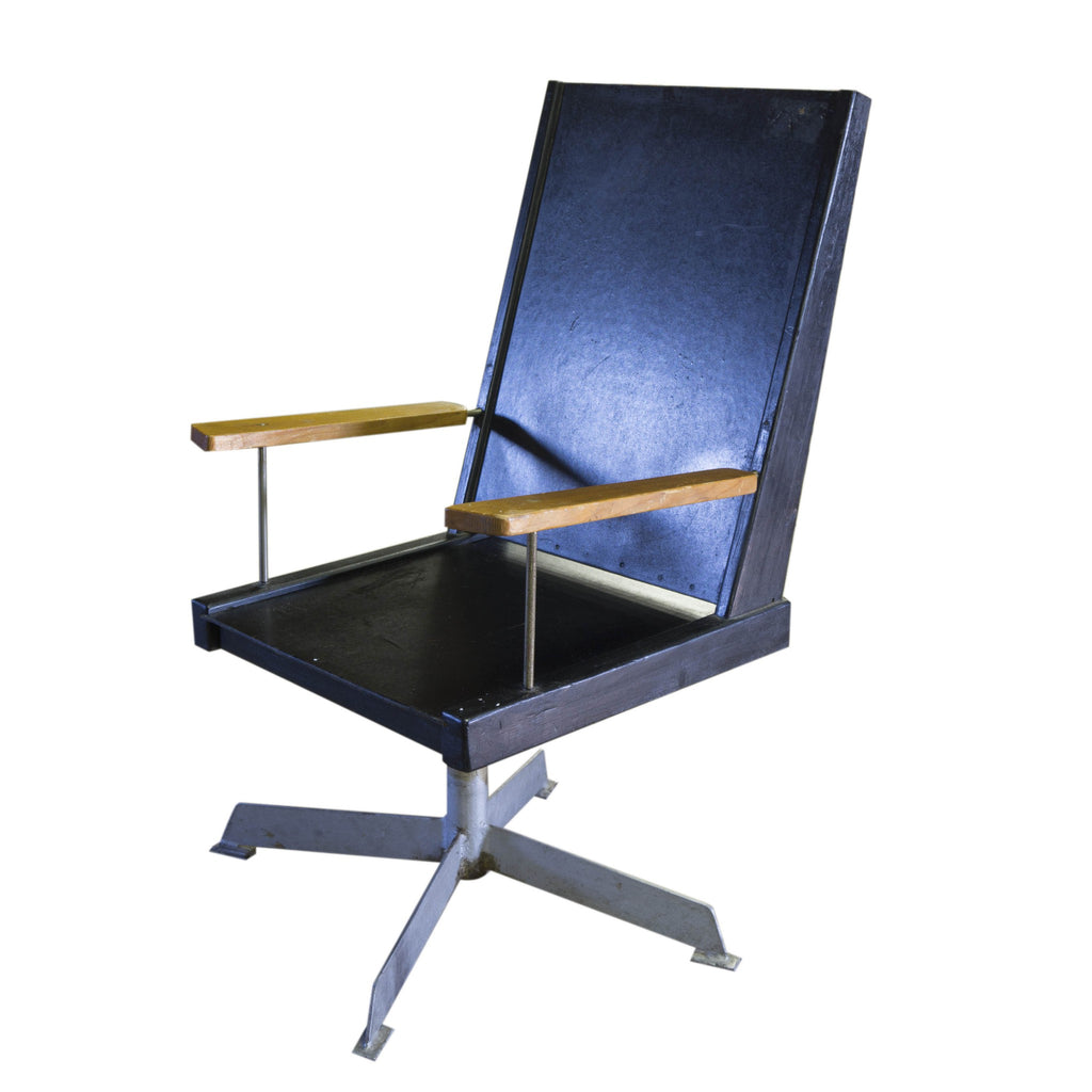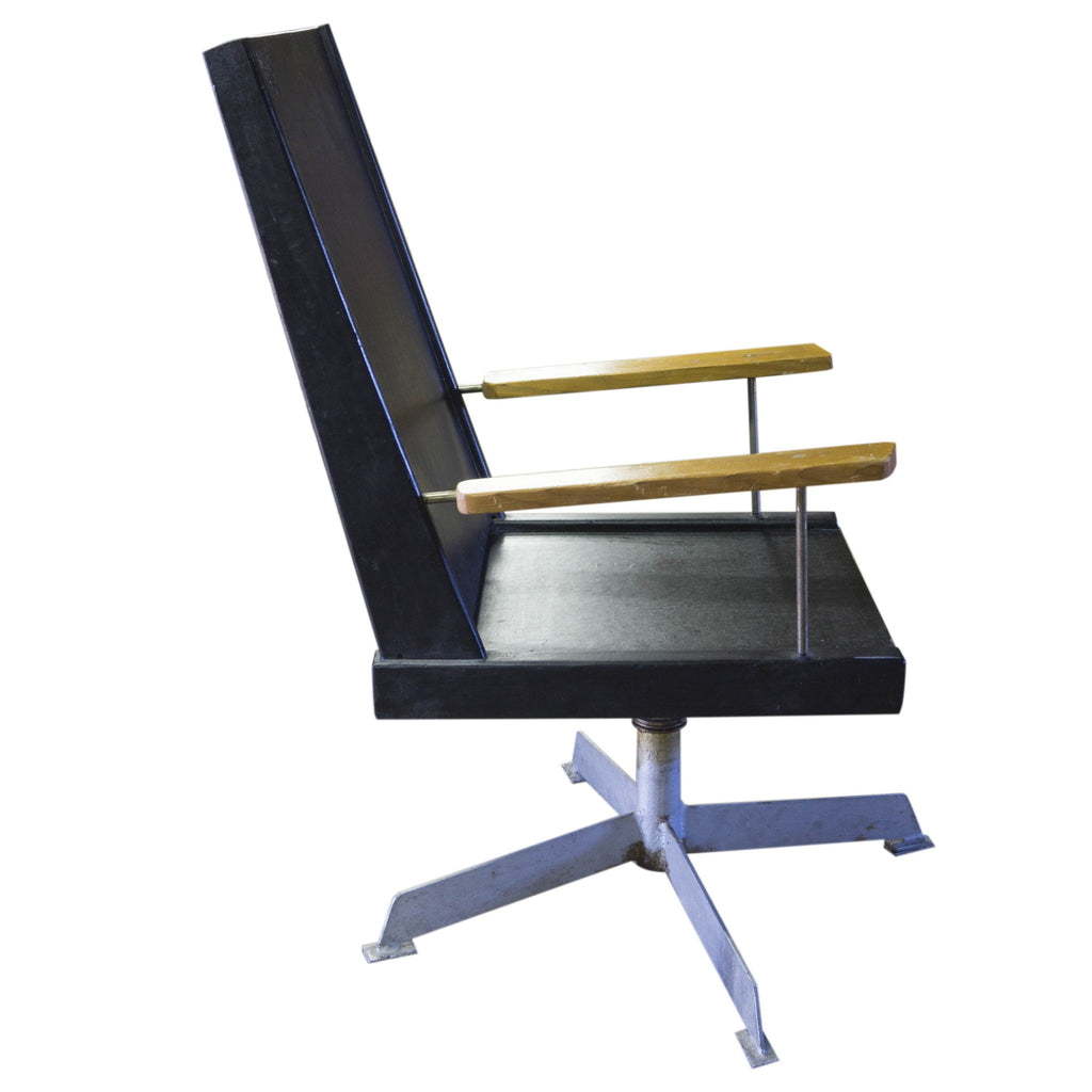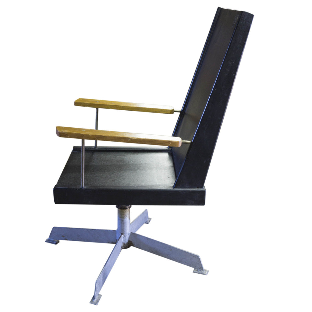 Excellent design of this swivel chair. Wooden lacquered construction. Wooden armrests on chromed rod. Very well preserved condition.