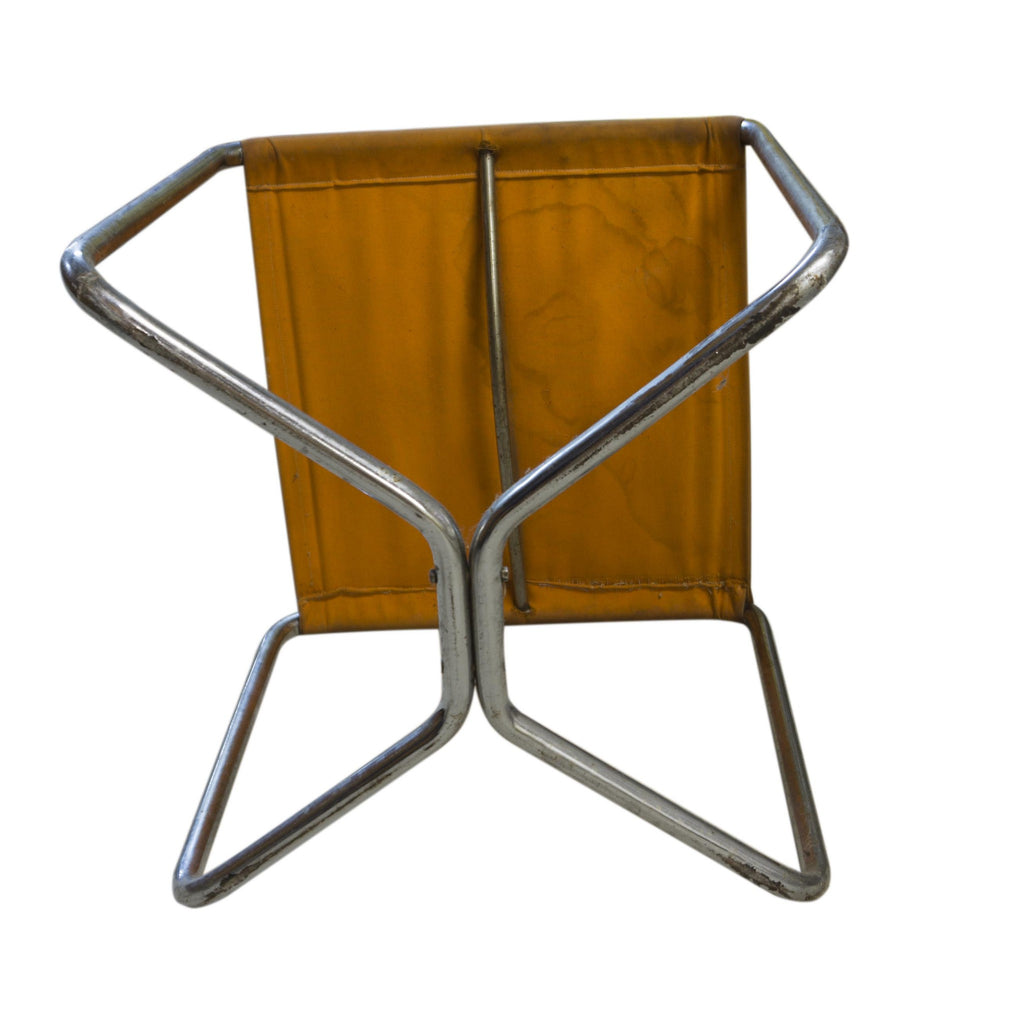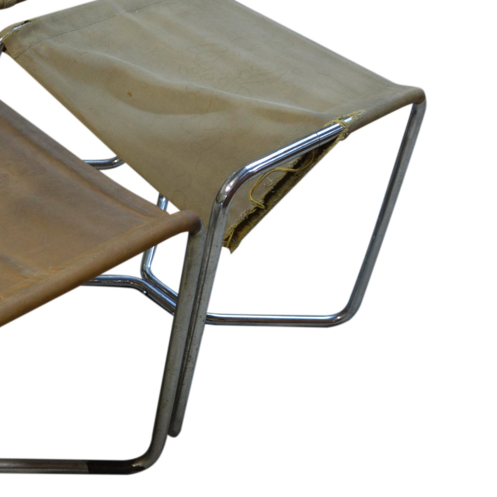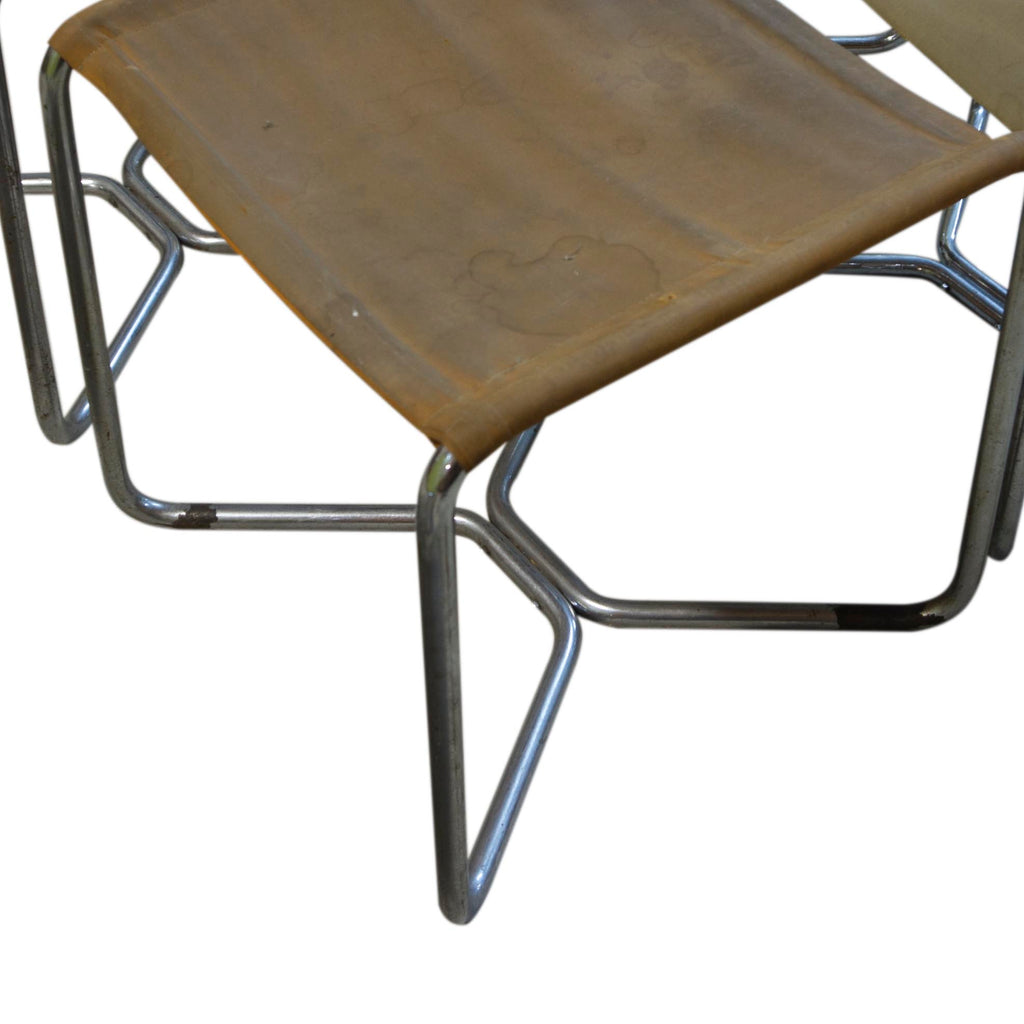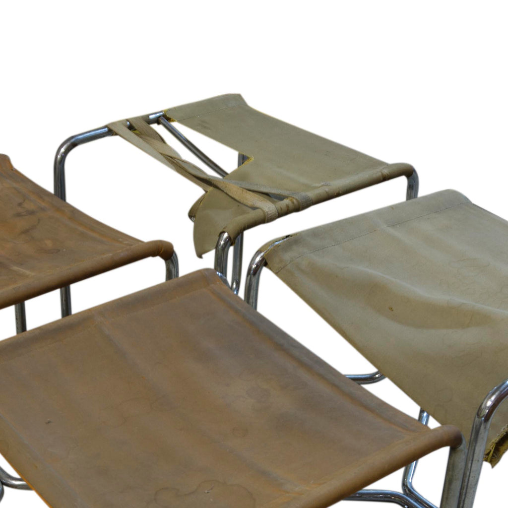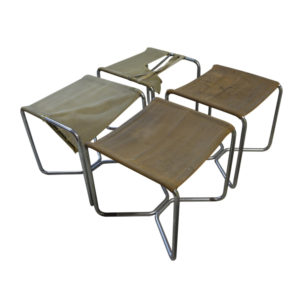 Tabourets cantilever en tubes d'acier de l'époque Bauhaus, avec assise en toile d'origine. La toile est endommagée, comme le montrent les photographies. Il est donc possible de tenter une restauration ou de la remplacer avec soin en utilisant le matériau d'origine comme référence.