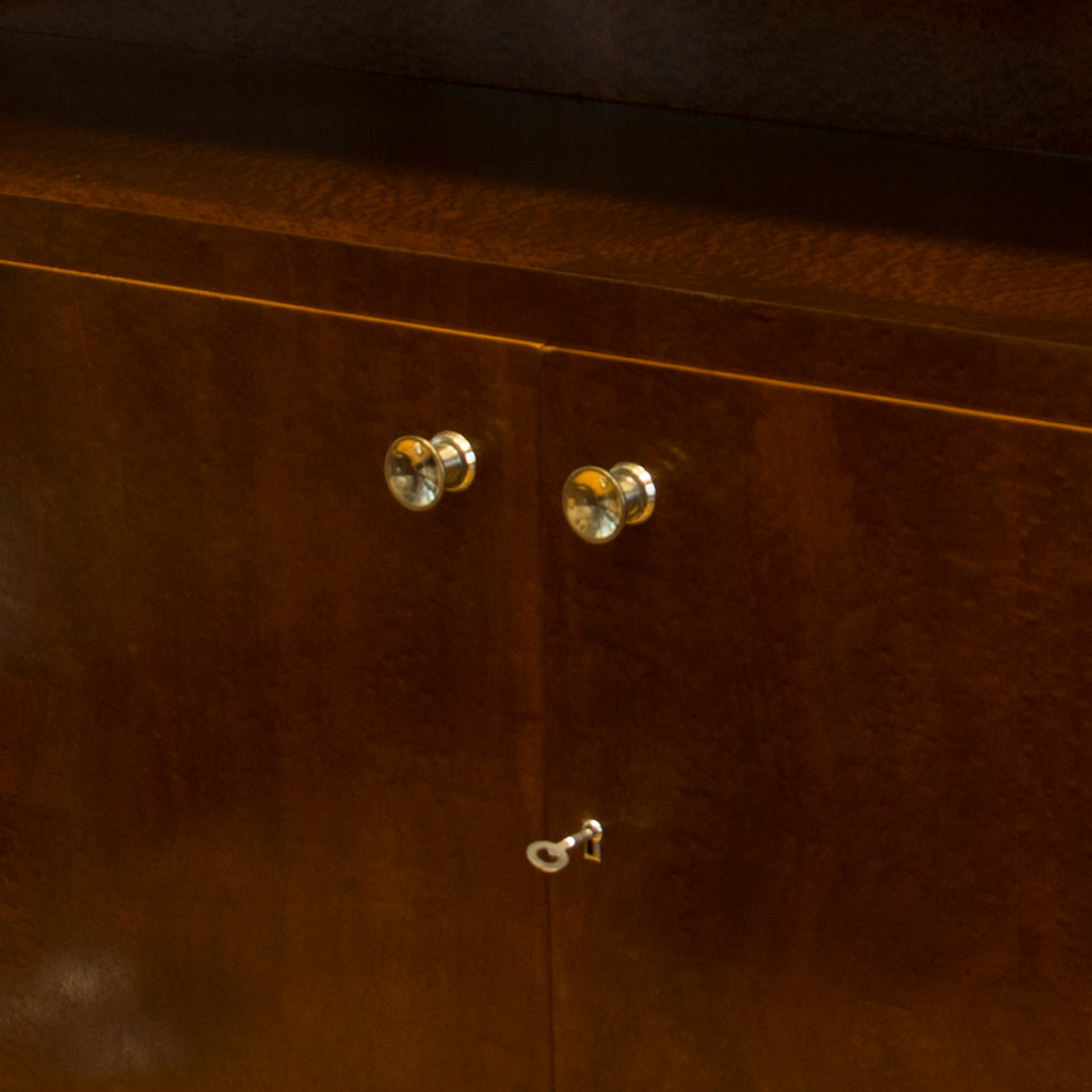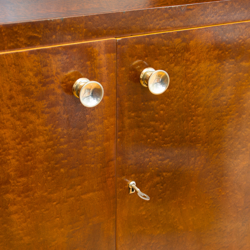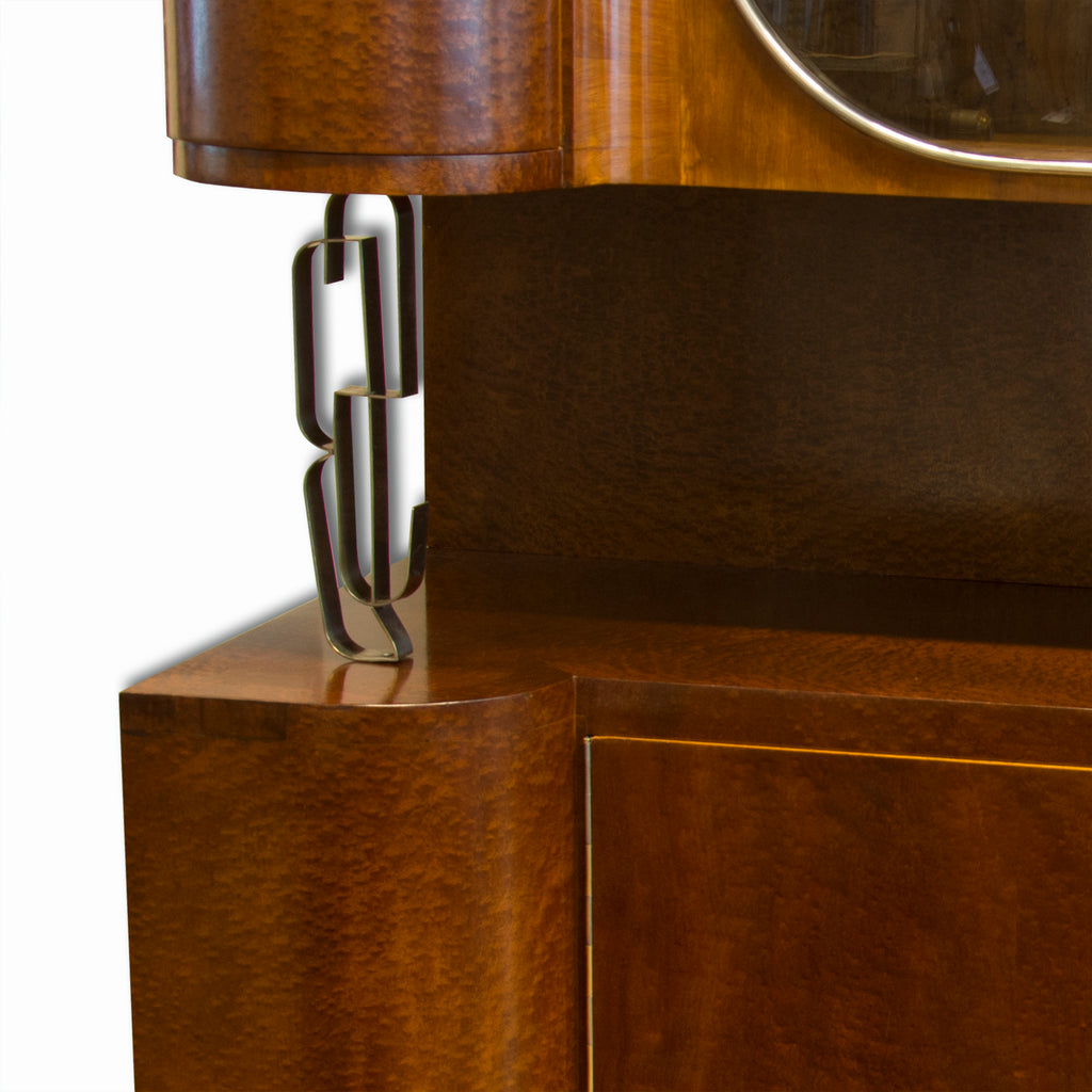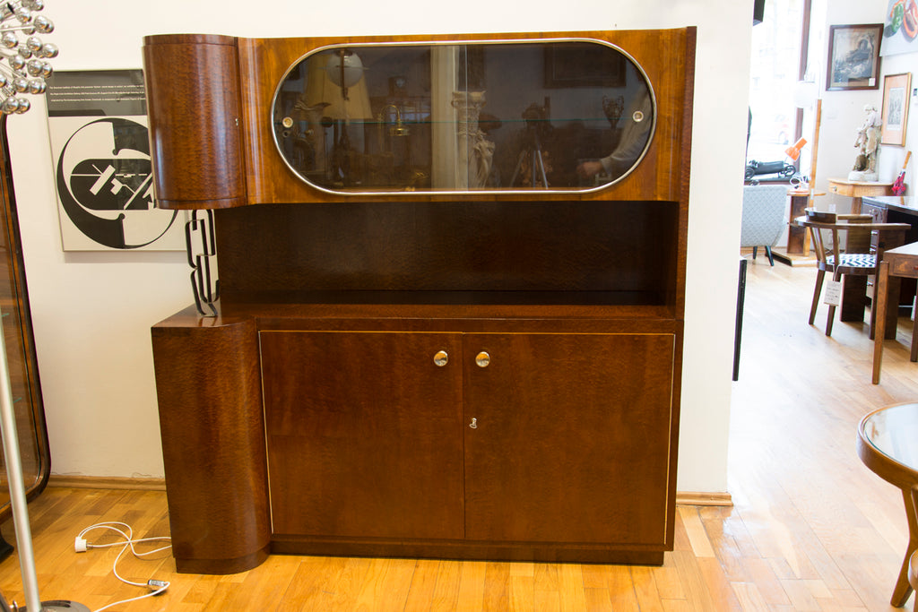 Meuble intemporel du célèbre architecte tchécoslovaque Robert Slezák. La partie inférieure abrite un espace de rangement avec deux portes et un angle incurvé accentué par une autre porte. Logée dans un cadre en acier chromé, la partie supérieure vitrée s'ouvre sur un espace de rangement supplémentaire avec étagères en verre. La partie supérieure est reliée à la partie inférieure par une équerre en métal chromé ornée des initiales de l'architecte « RS ». Placage en érable. Entièrement restaurée, en excellent état.