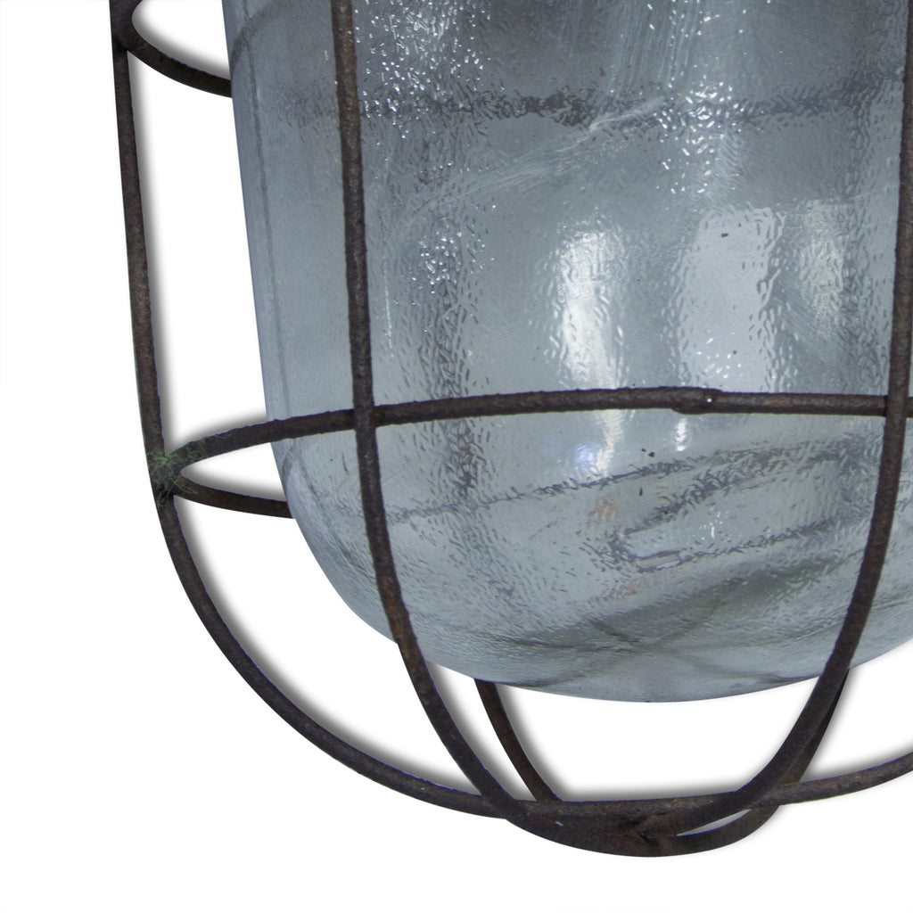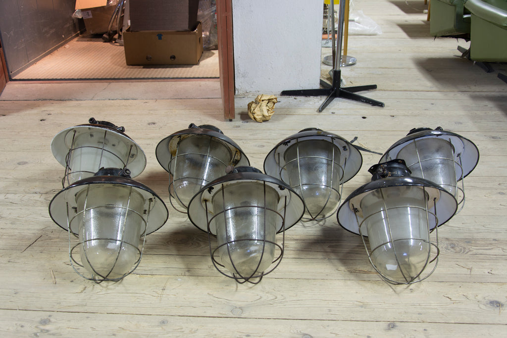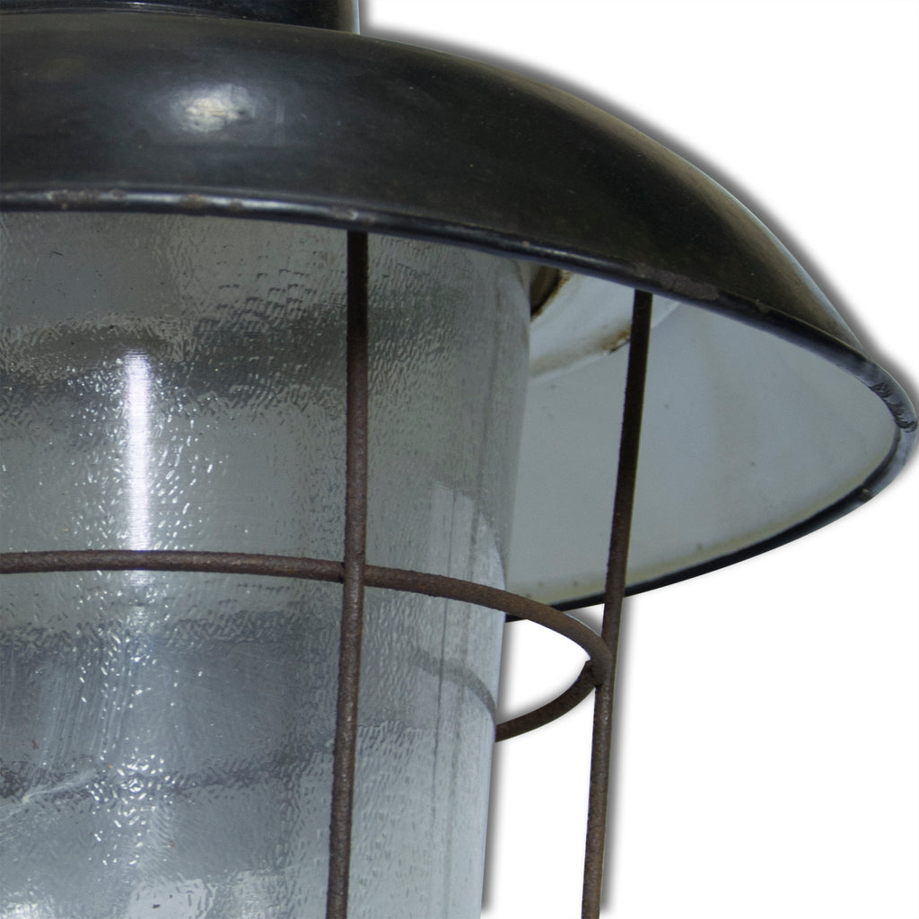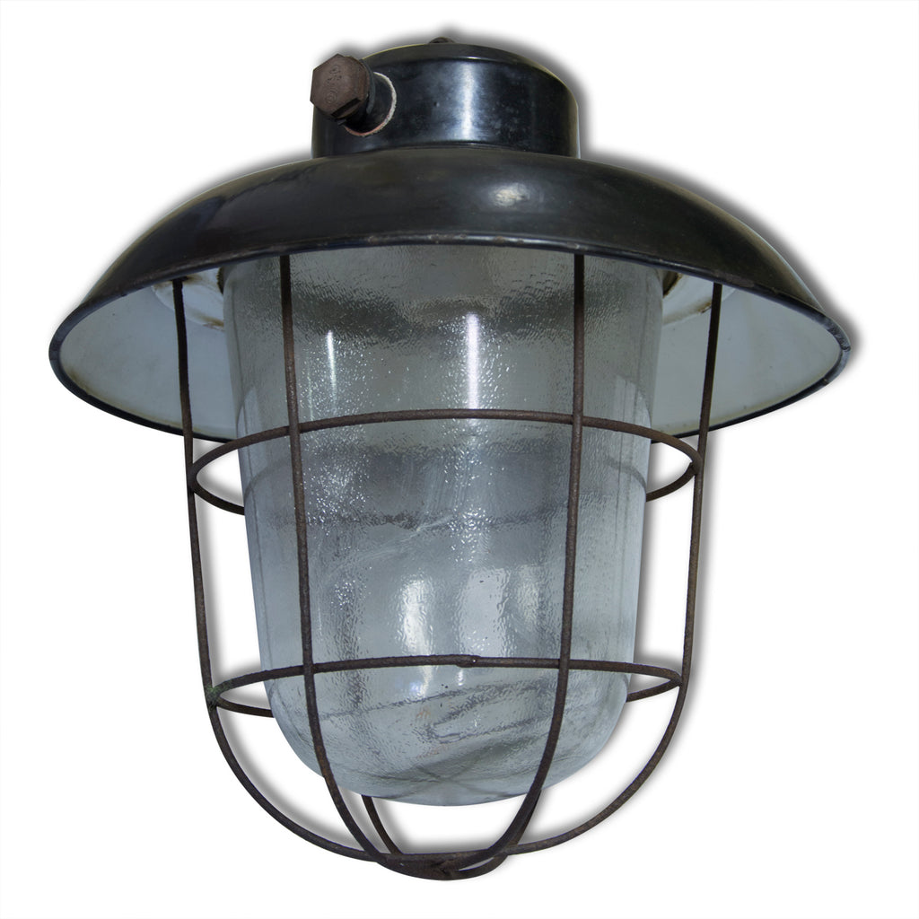 Suspensions tchécoslovaques vintage Factory avec grille de protection, fabriquées dans les années 1960, avec structure en métal émaillé. En bon état vintage. 7 pièces actuellement en stock ; 20 autres pièces sont disponibles si vous êtes intéressé.