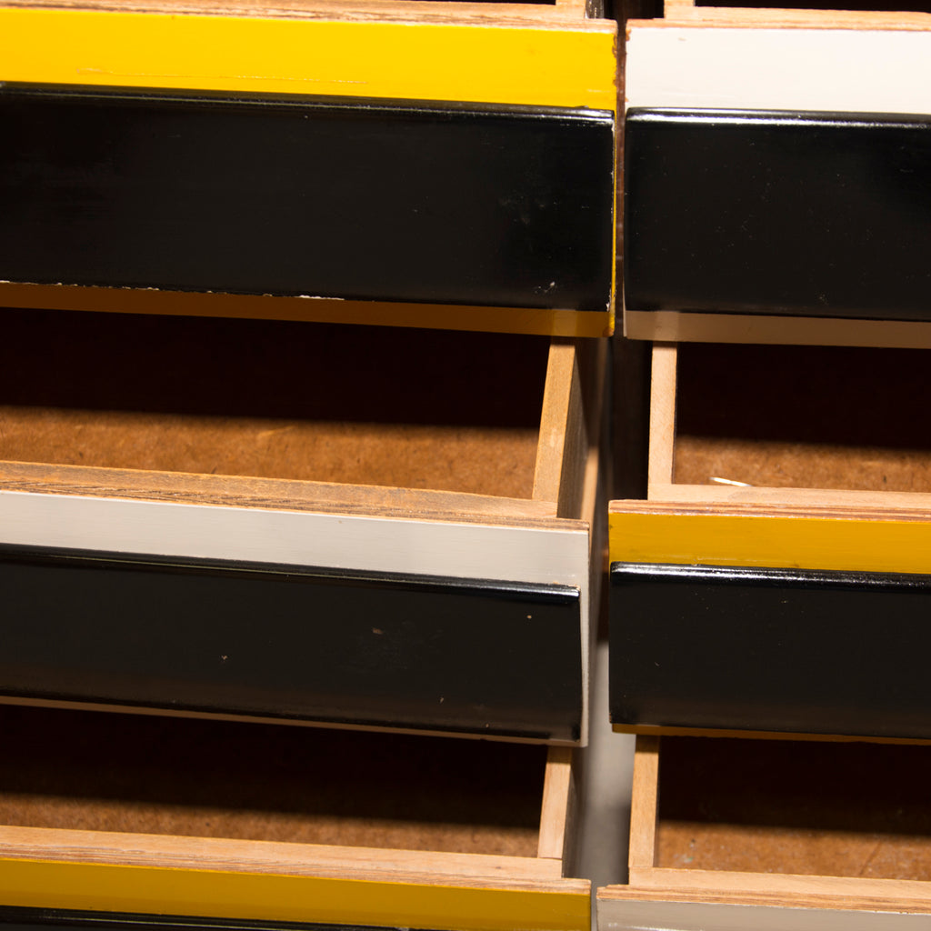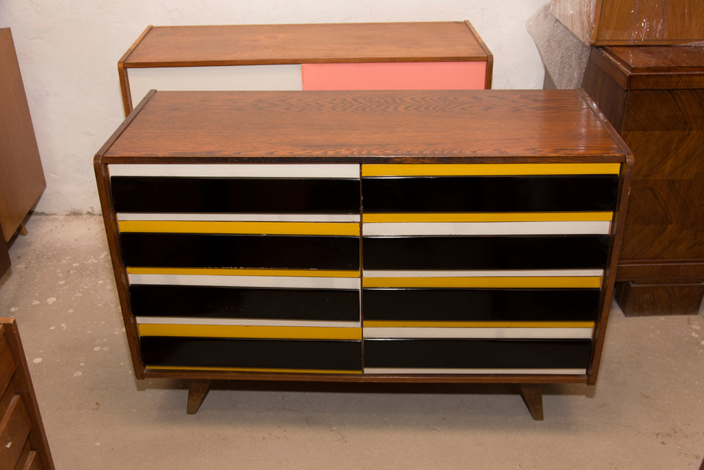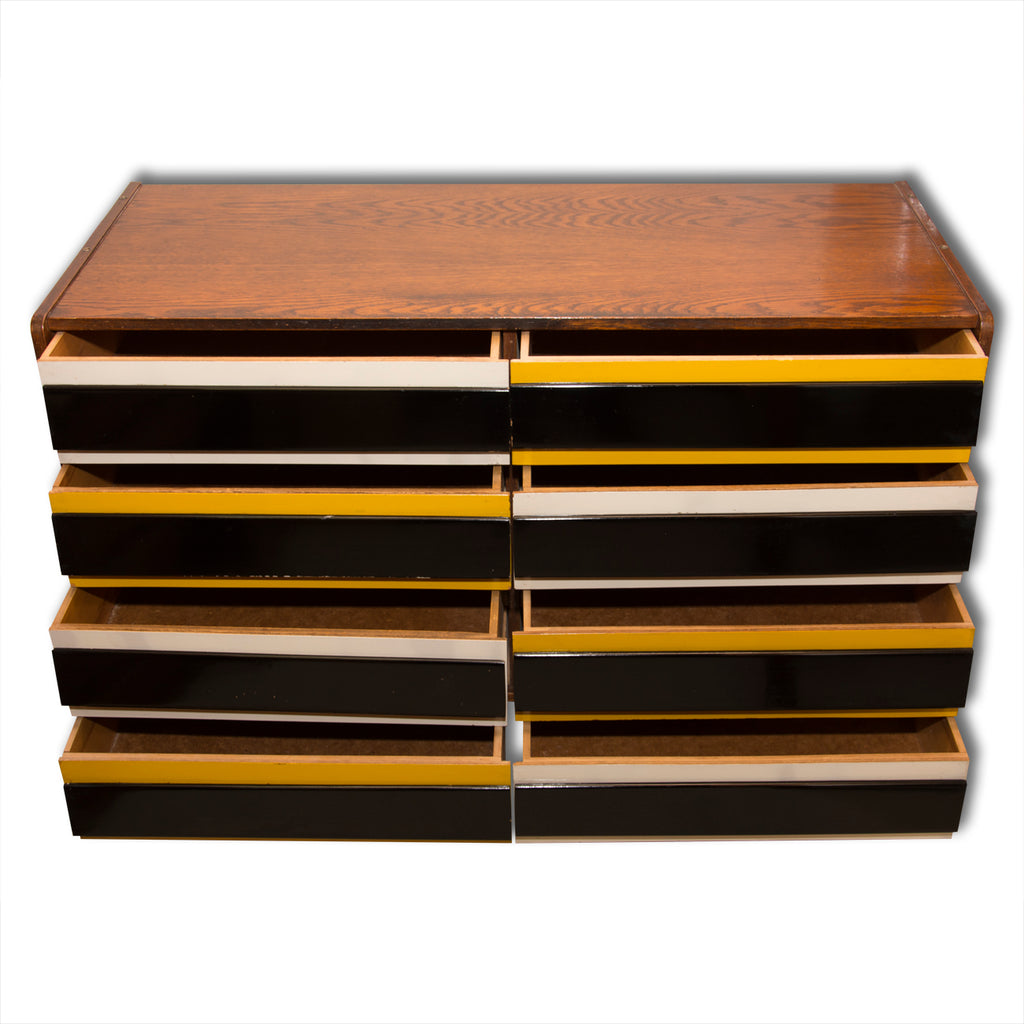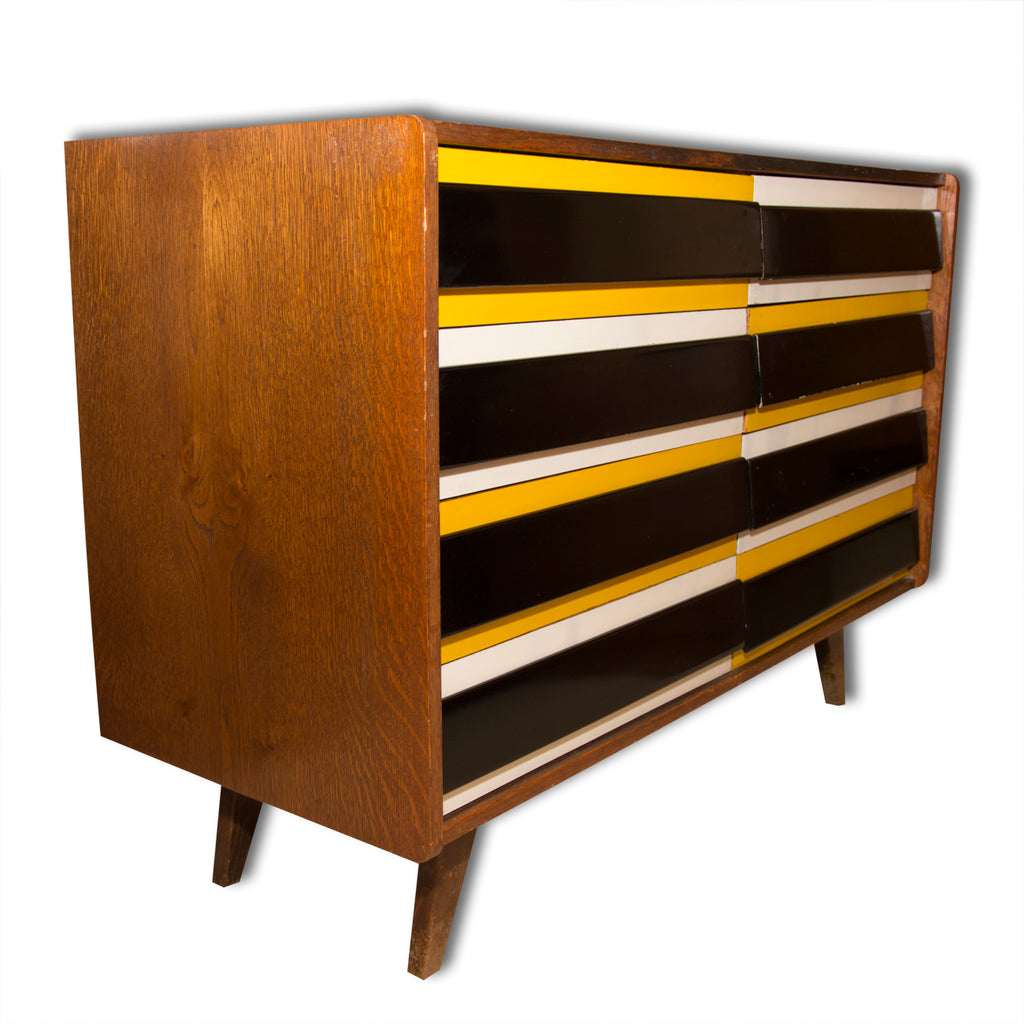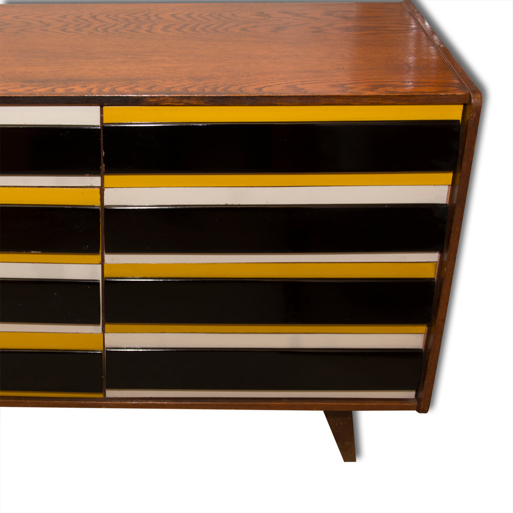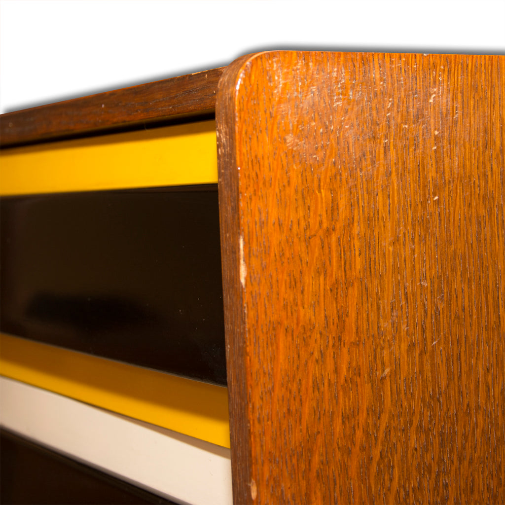 Secrétaire / buffet vintage populaire U-453 des années 60 du siècle dernier. Europe centrale, associé à la célèbre EXPO 58 (période bruxelloise). Hêtre. Tiroirs laqués colorés. Quelques abrasions et rayures dues au temps et à l'usage. En bon état général.