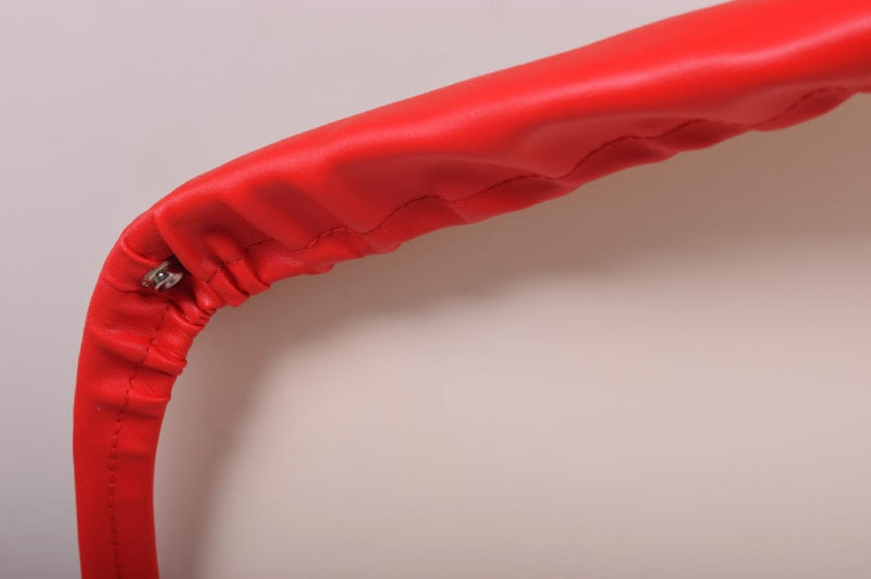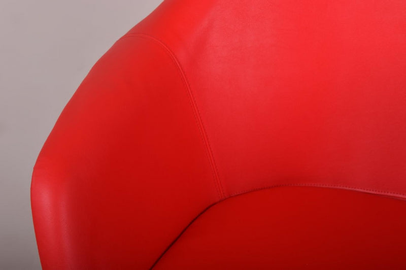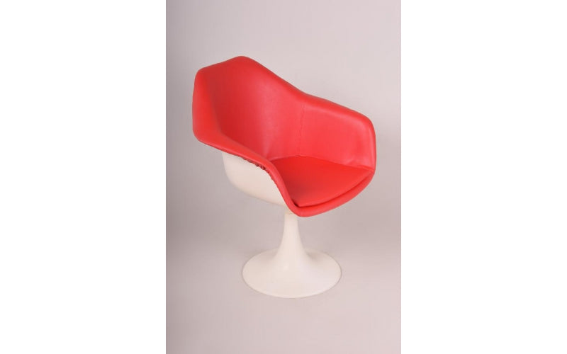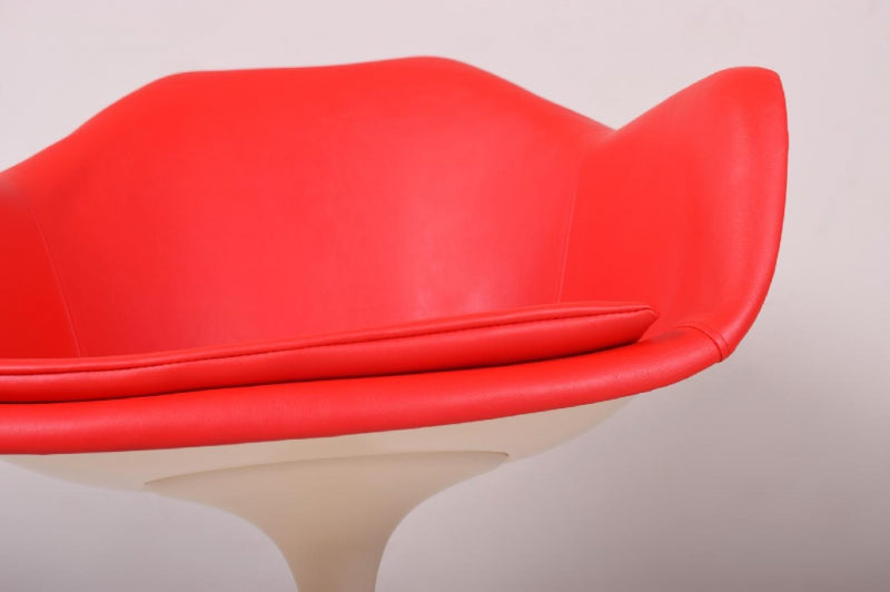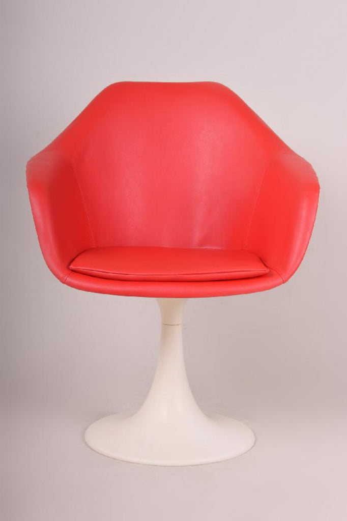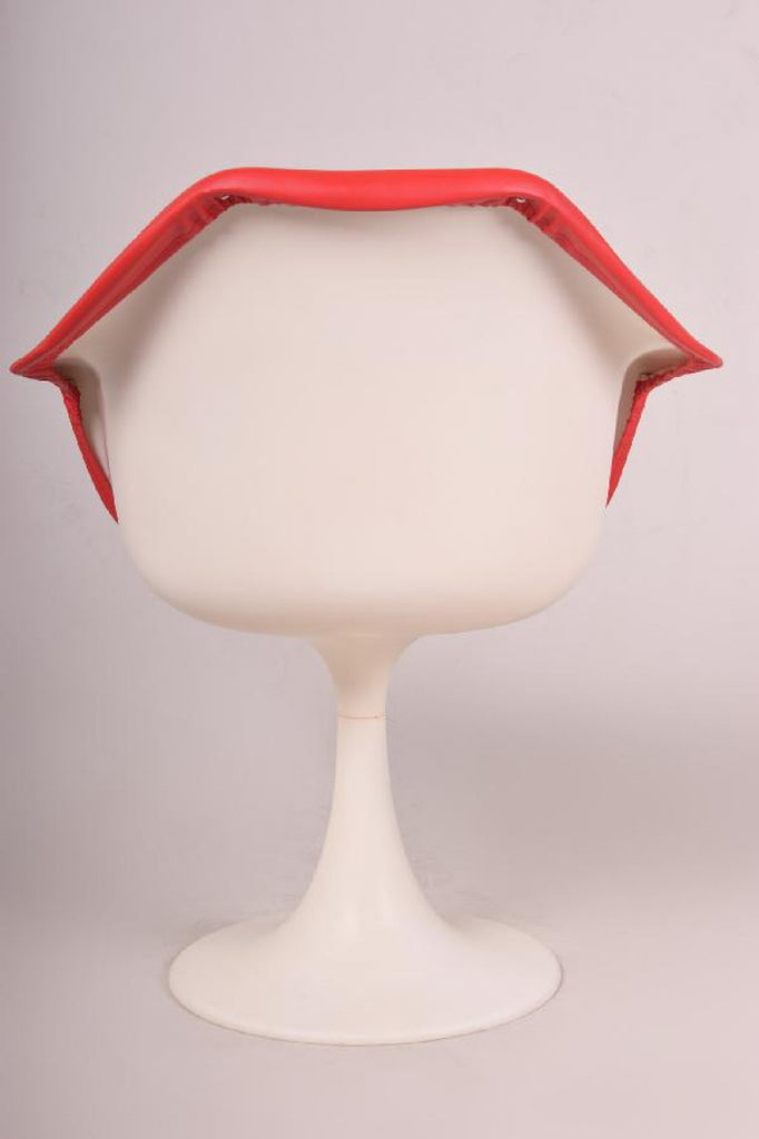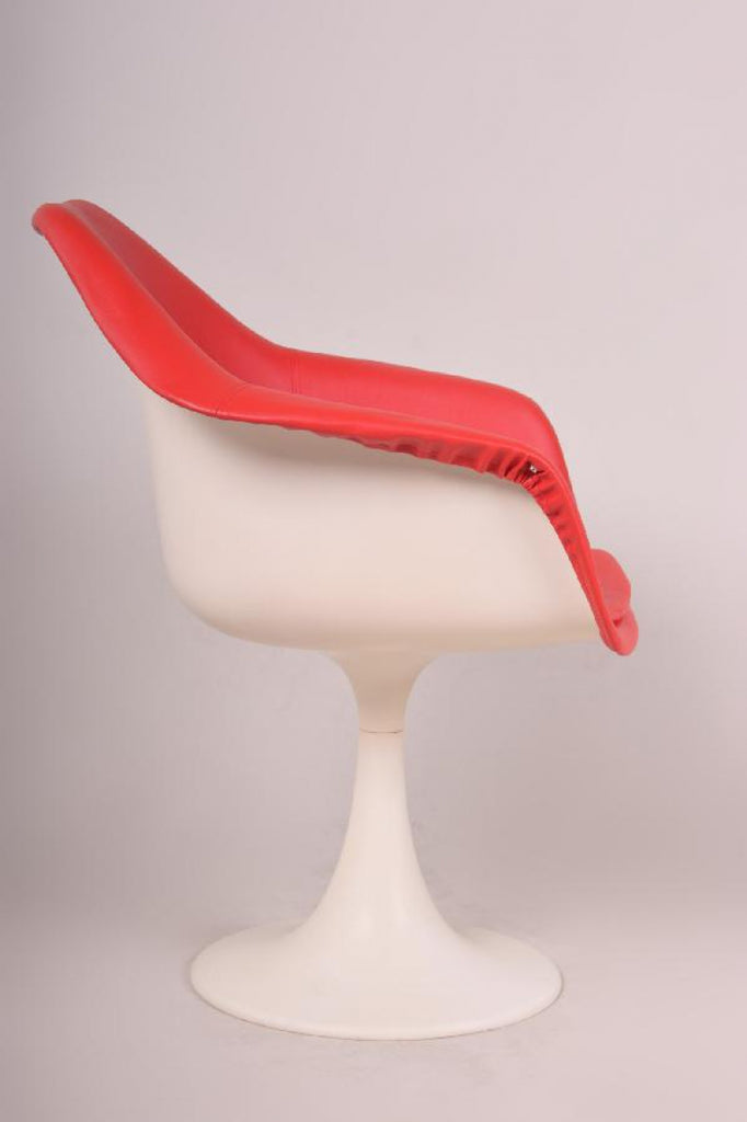 Cette chaise Tulip en plastique a été conçue par Eero Saarinen en 1956. Elle est dotée d'un nouveau revêtement en similicuir rouge. Elle a été produite en Italie sous licence Knoll International dans les années 1970. Elle a été exposée au MoMA de New York et a fait partie de nombreuses collections privées.