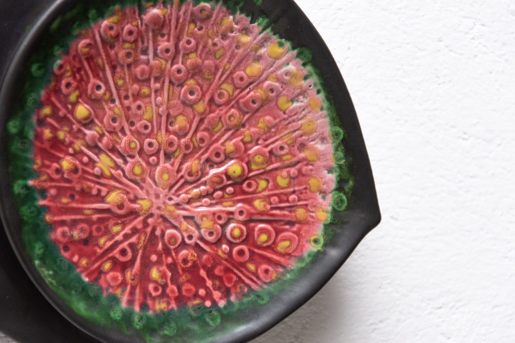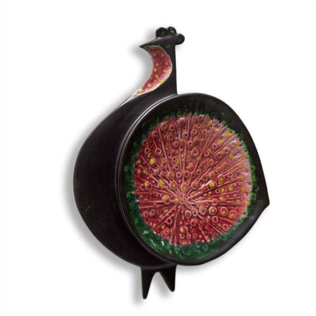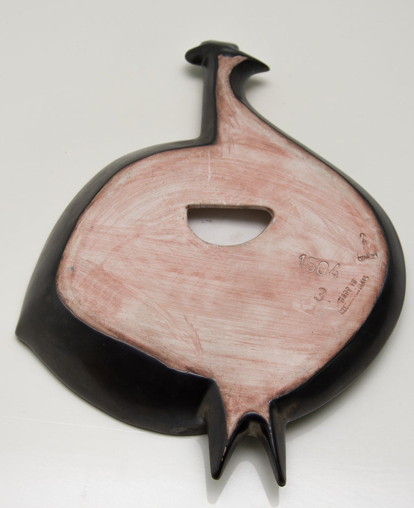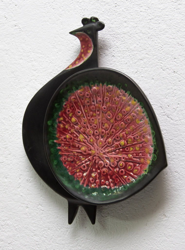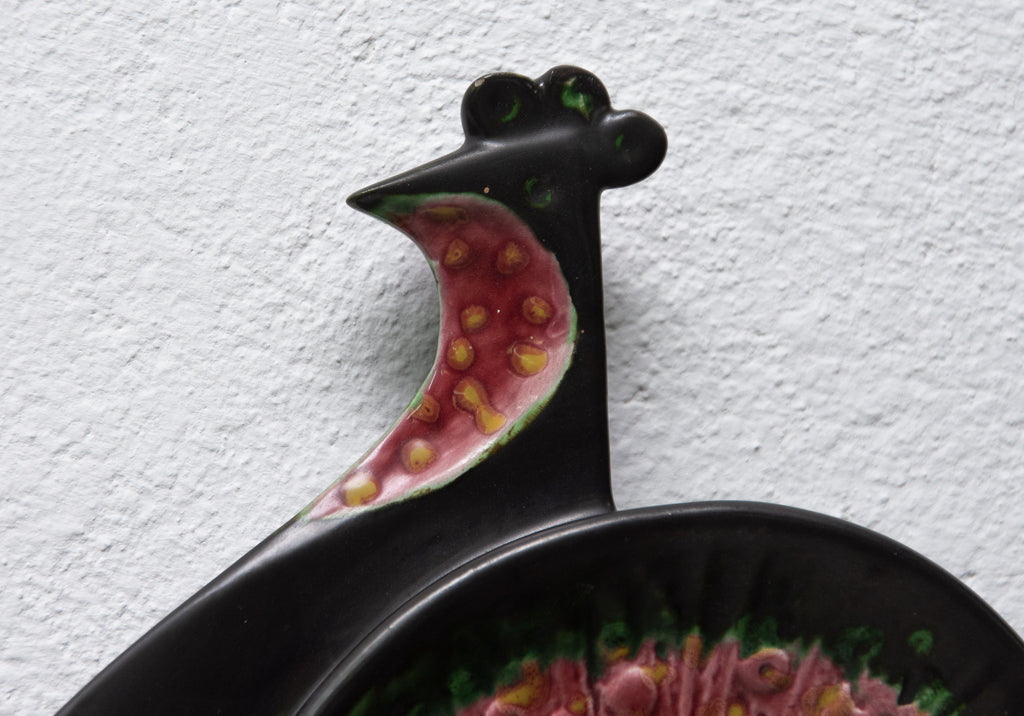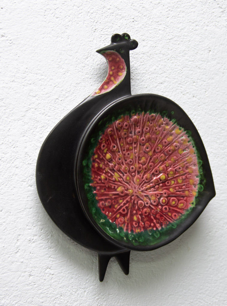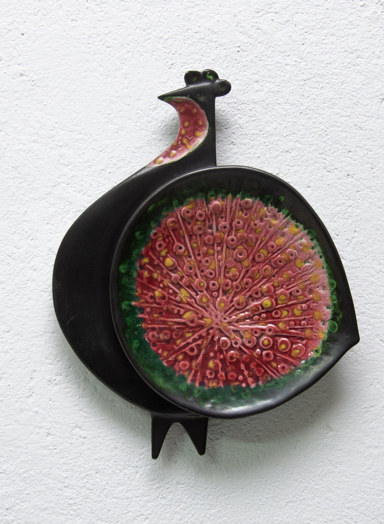 Sculpture murale en céramique à motif de paon. Réalisée par Keramia dans les années 1960, elle est émaillée d'une glaçure métallique. Ce style correspond à la période dite bruxelloise en Tchécoslovaquie, en lien avec l'EXPO 58 de Bruxelles. En excellent état.