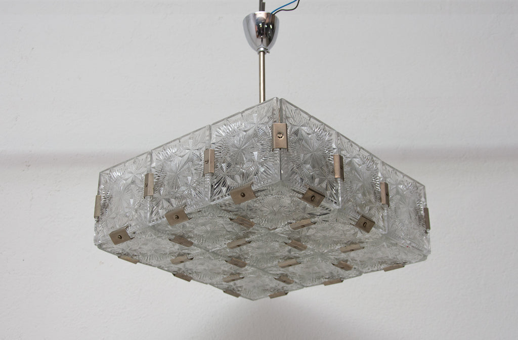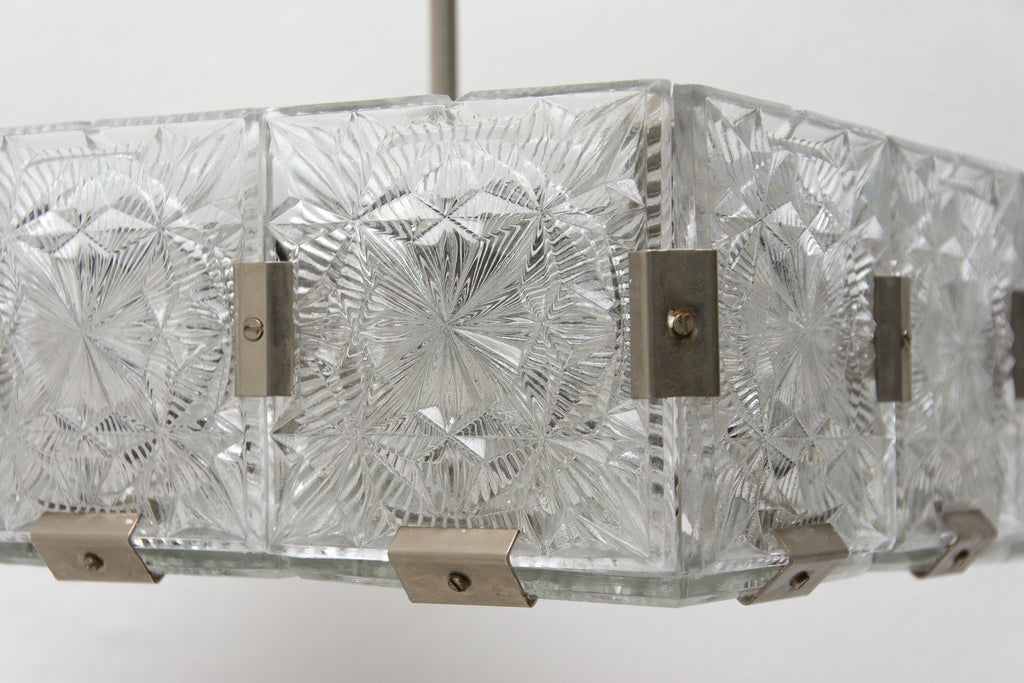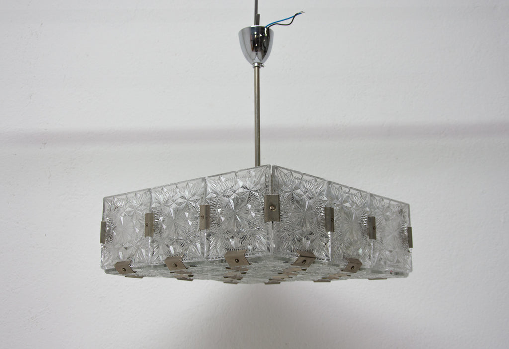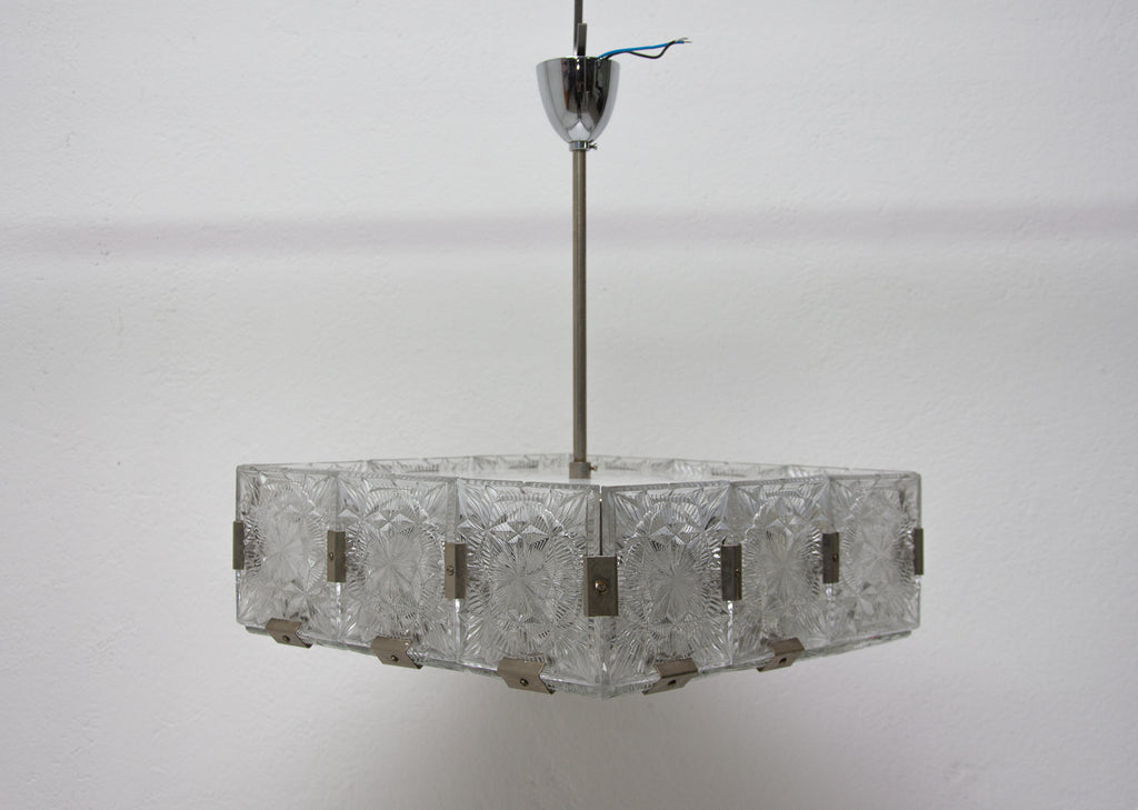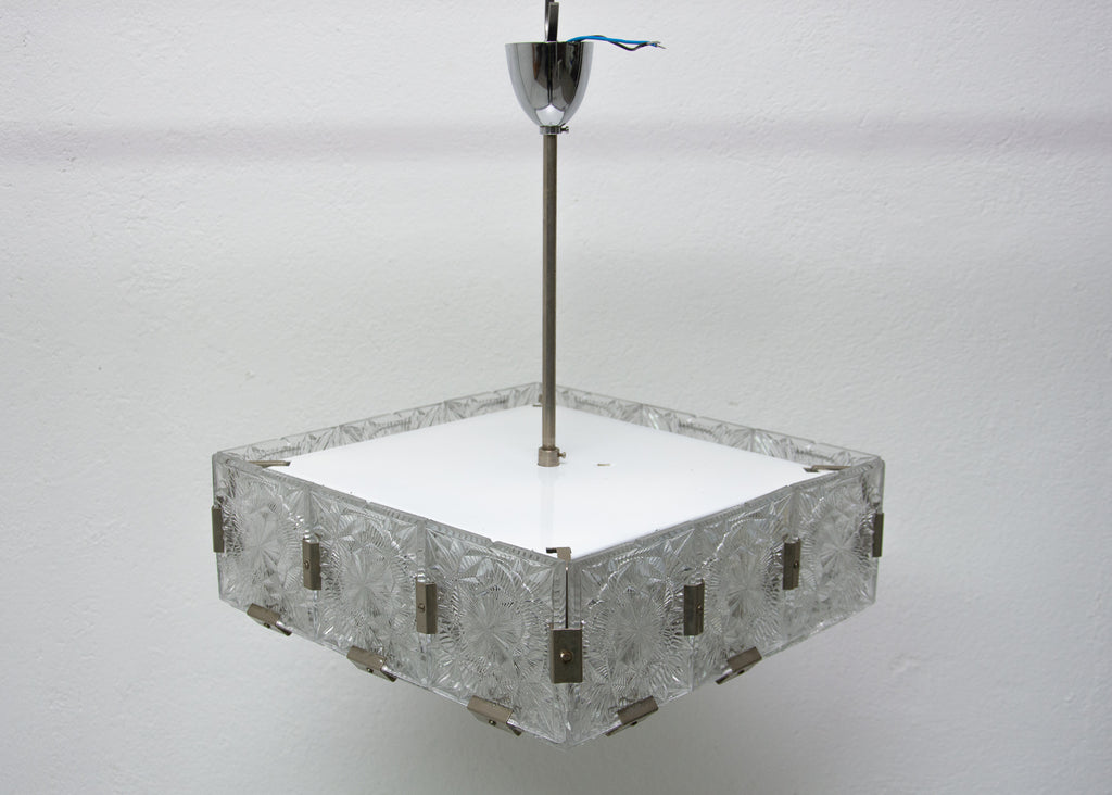 Suspension en verre et acier chromé, vers 1970, Tchécoslovaquie. Fabriquée par Kamenický senov, elle allie verre et métal. Elle a été entièrement nettoyée et recâblée par un professionnel. Douille E27. Jusqu'à 250 V.