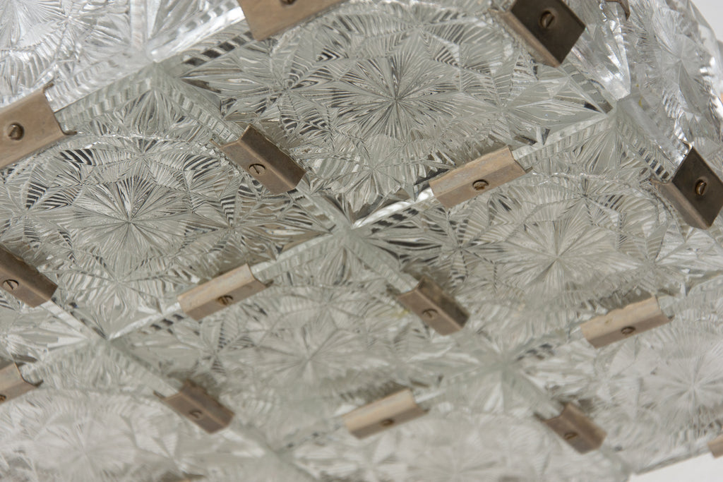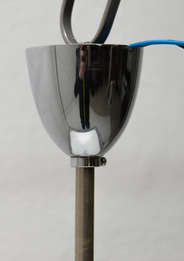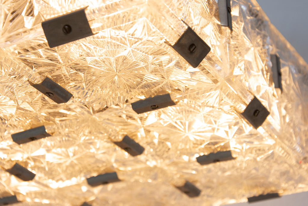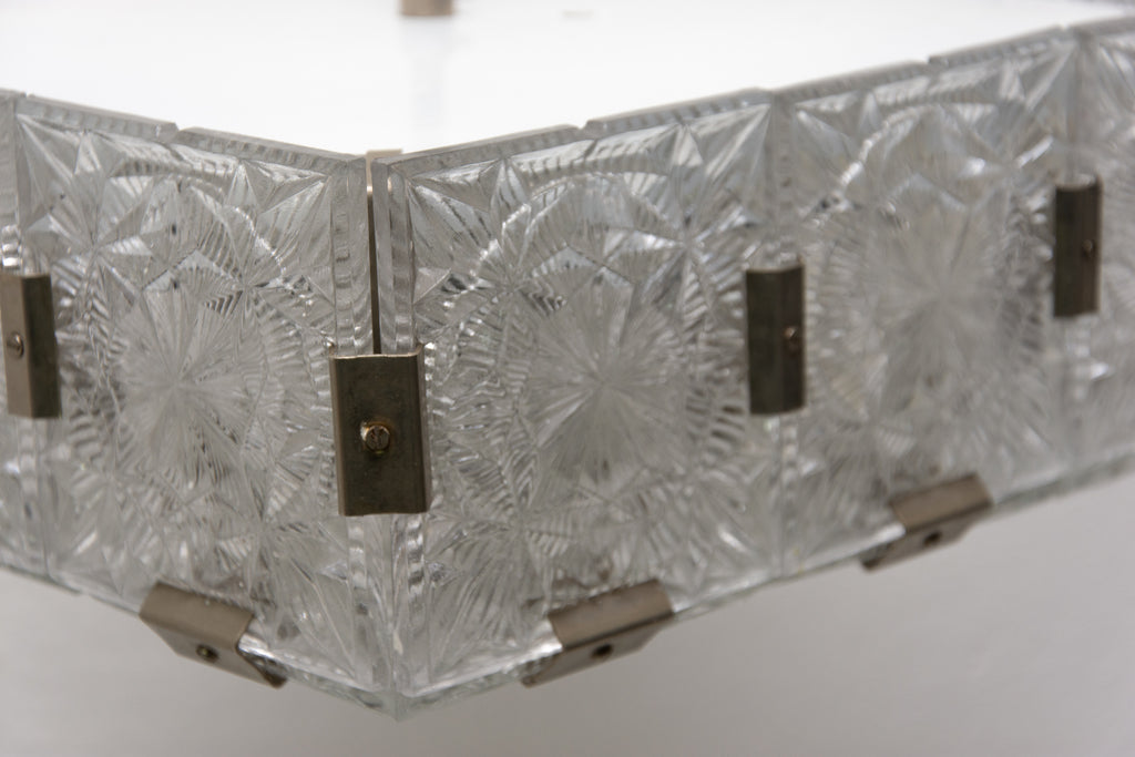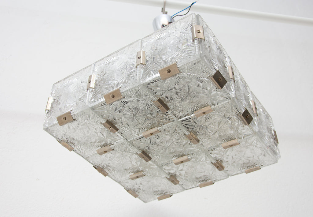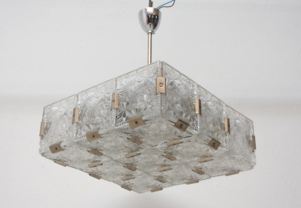 Suspension en verre et acier chromé, vers 1970, Tchécoslovaquie. Fabriquée par Kamenický senov, elle allie verre et métal. Elle a été entièrement nettoyée et recâblée par un professionnel. Douille E27. Jusqu'à 250 V.