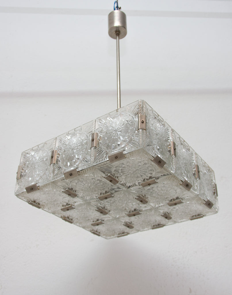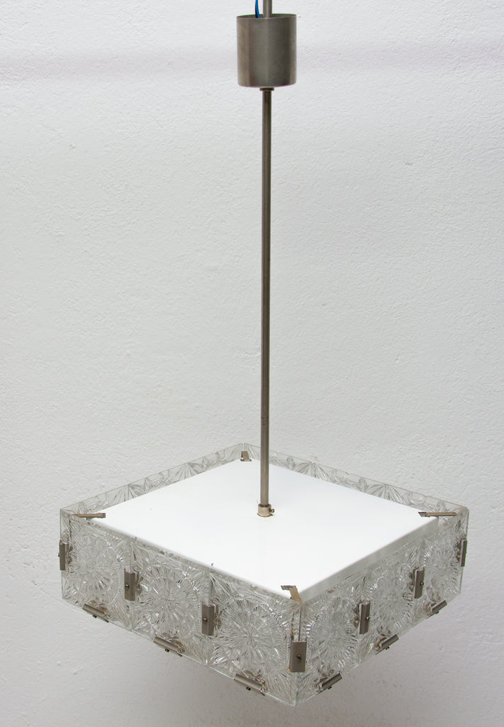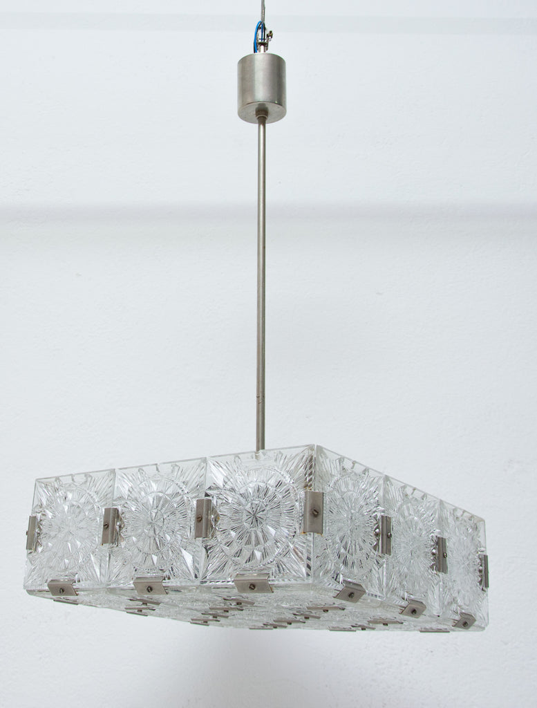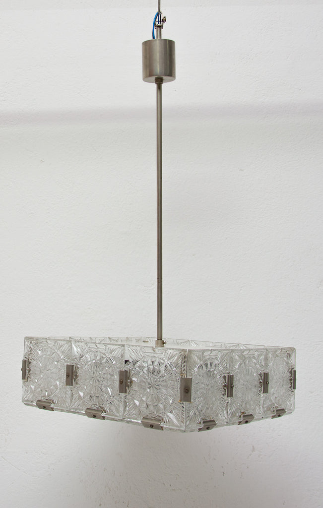 Suspension en verre et acier chromé, vers 1970, Tchécoslovaquie. Fabriquée par Kamenický senov, elle allie verre et métal. Elle a été entièrement nettoyée et recâblée par un professionnel. Douille E27. Jusqu'à 250 V.