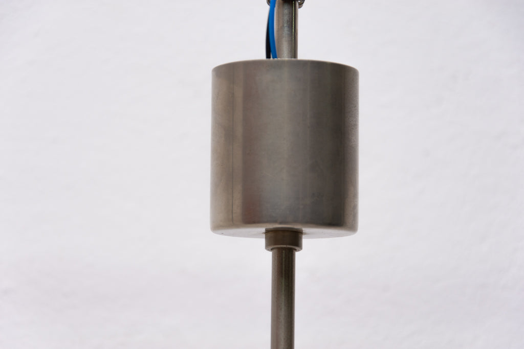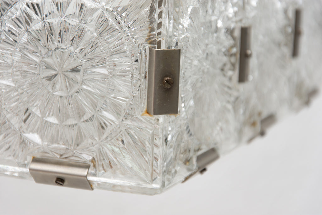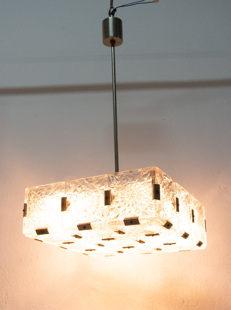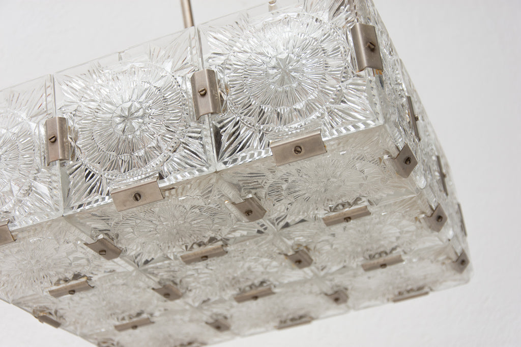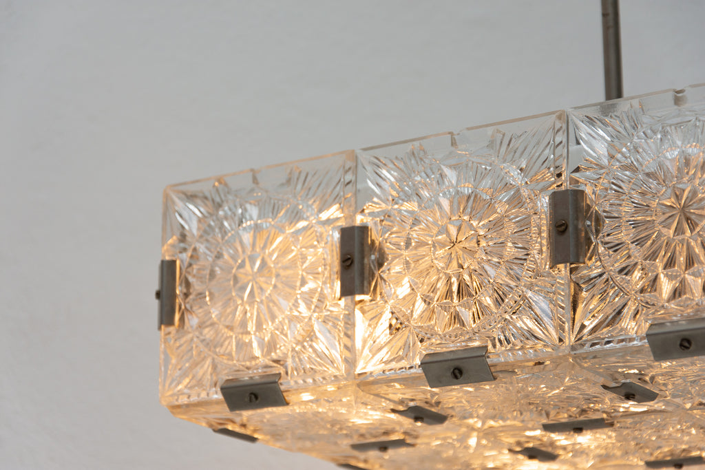 Suspension en verre et acier chromé, vers 1970, Tchécoslovaquie. Fabriquée par Kamenický senov, elle allie verre et métal. Elle a été entièrement nettoyée et recâblée par un professionnel. Douille E27. Jusqu'à 250 V.