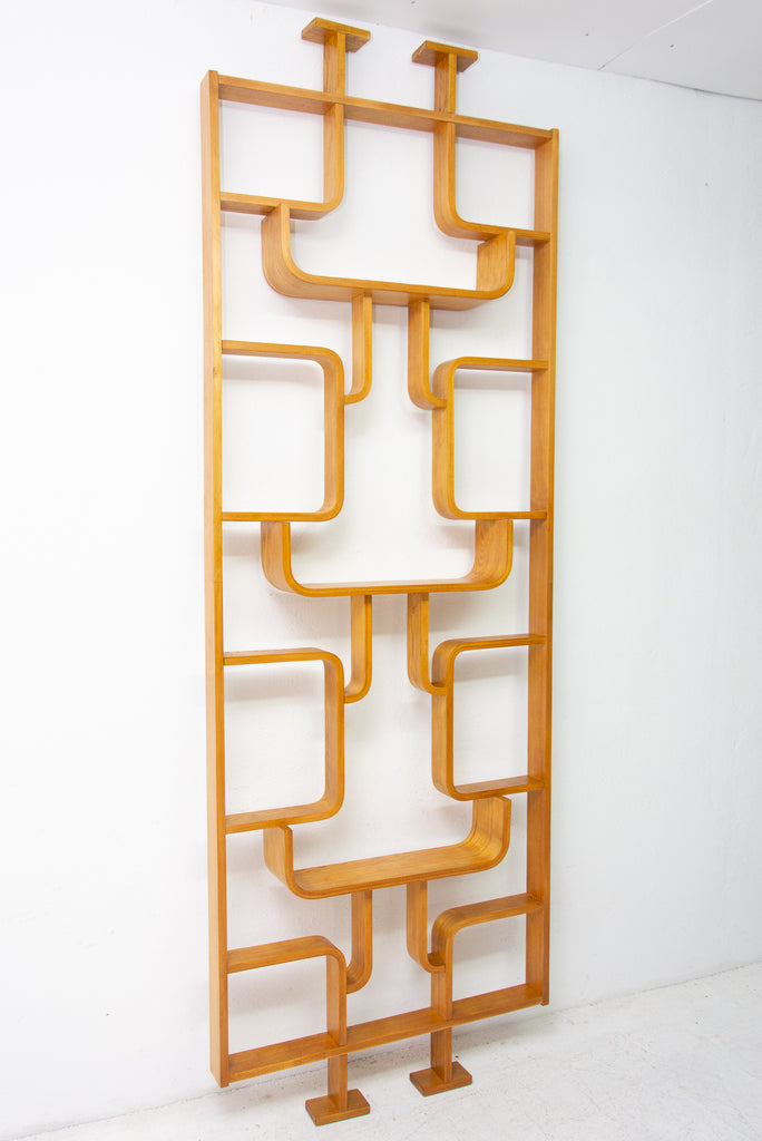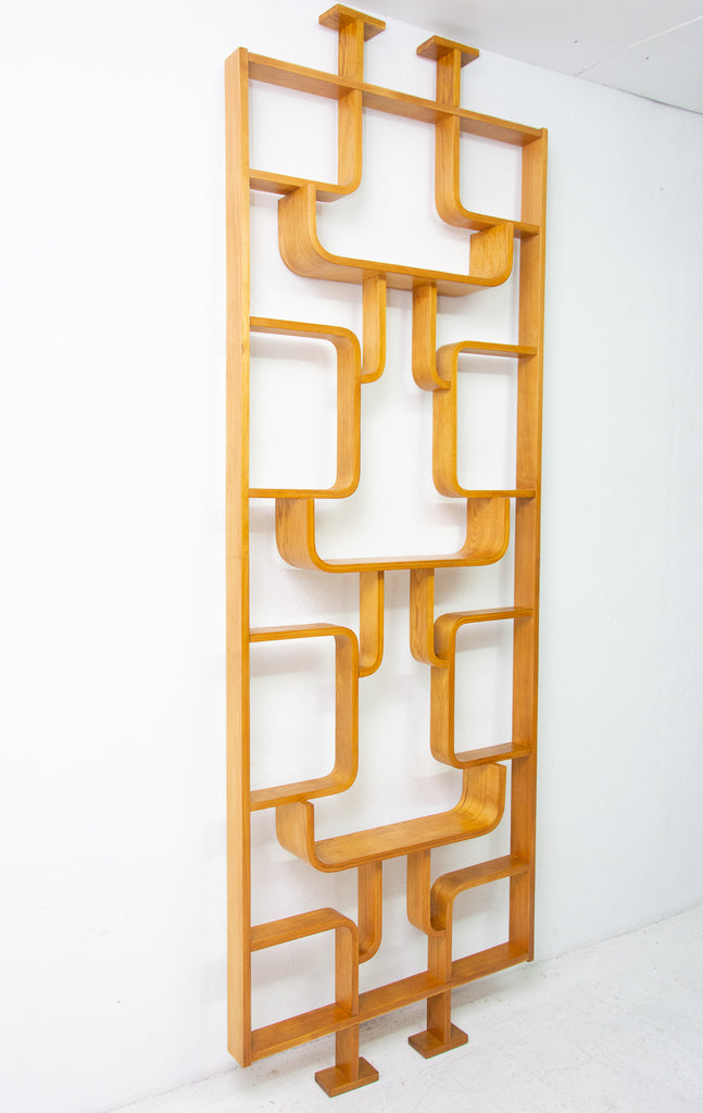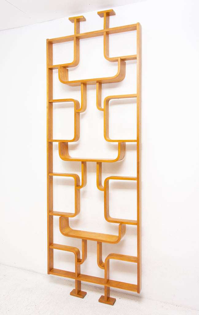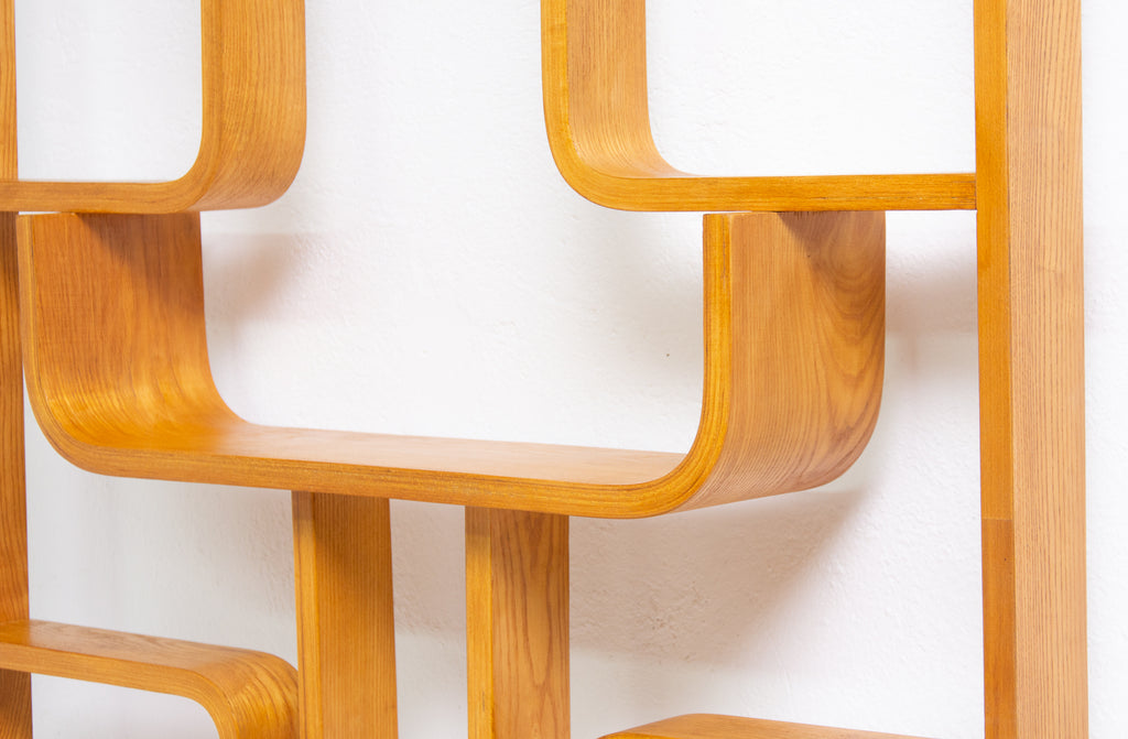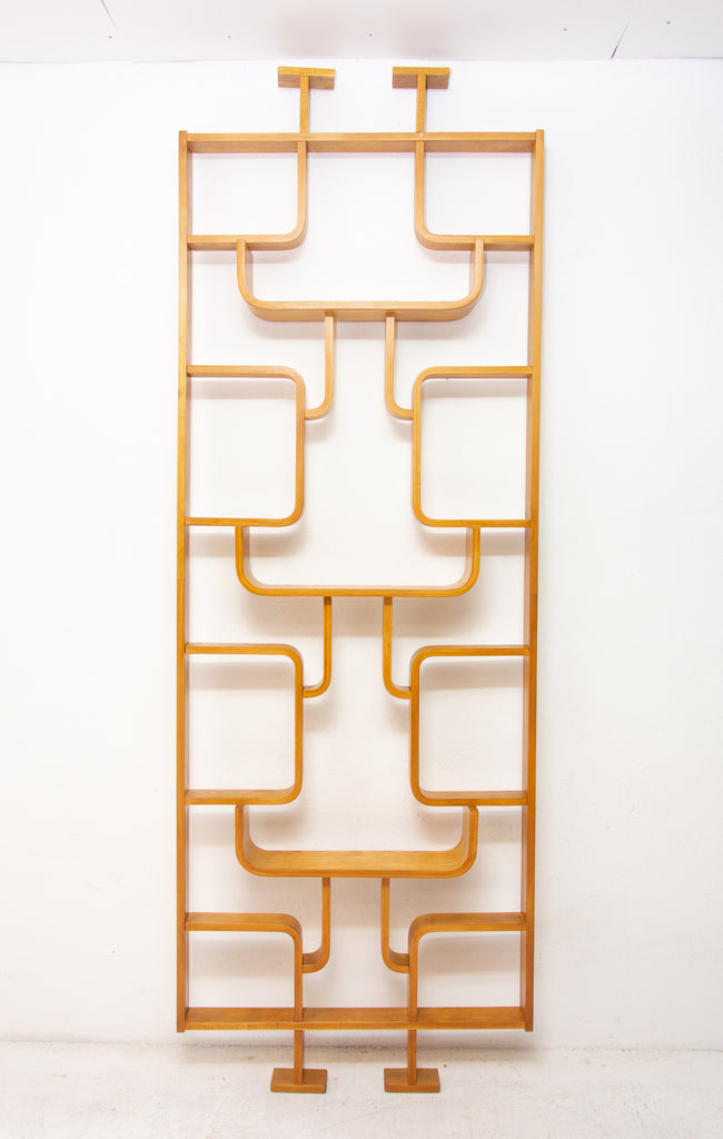 This room/wall divider was designed by the Czech architect Ludvik Volak and produced by Drevopodnik Holesov in the former Czechoslovakia during the 1970s. The divider is made of bent multilayer plywood and is veneered with beech or ash veneer.