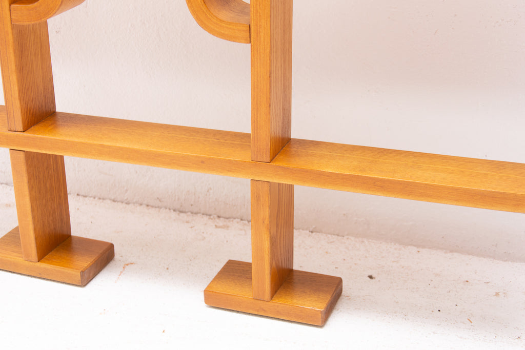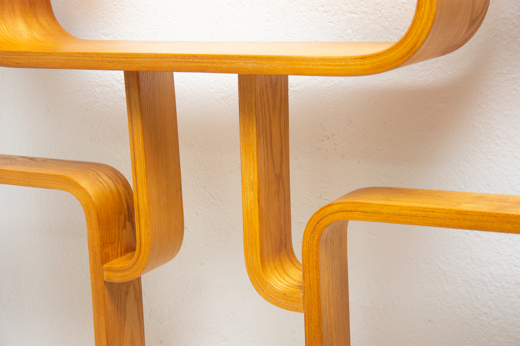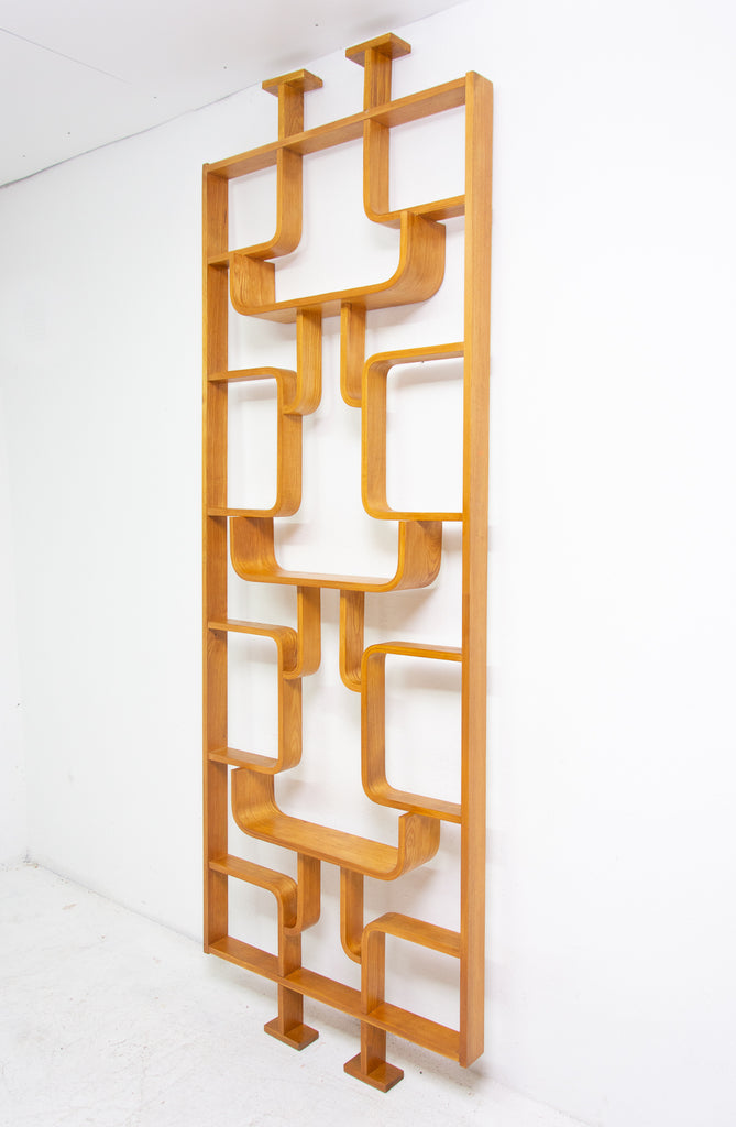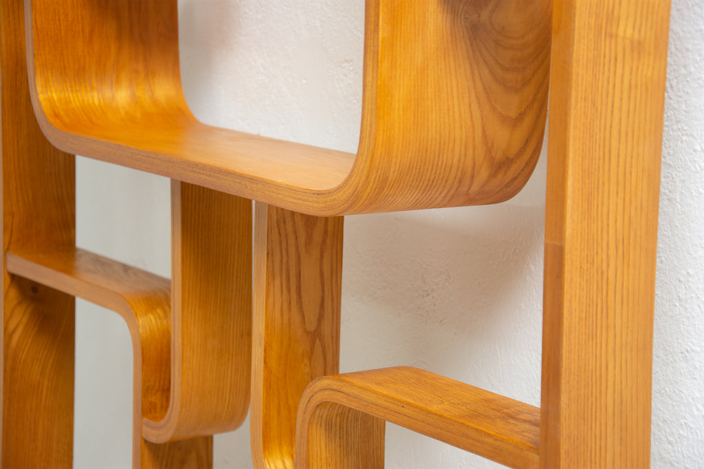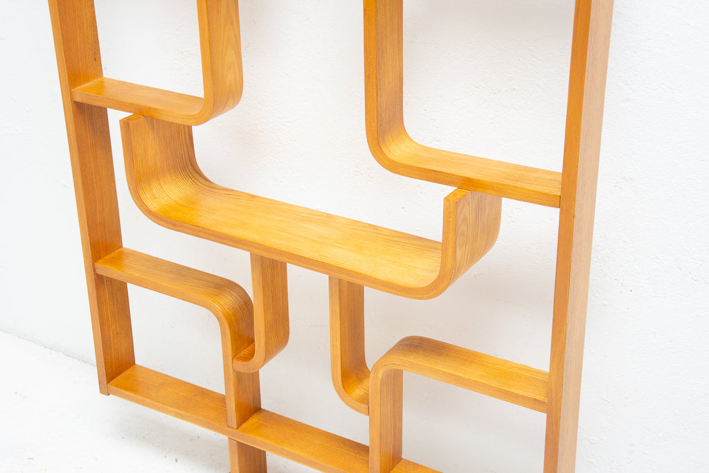 This room/wall divider was designed by the Czech architect Ludvik Volak and produced by Drevopodnik Holesov in the former Czechoslovakia during the 1970s. The divider is made of bent multilayer plywood and is veneered with beech or ash veneer.