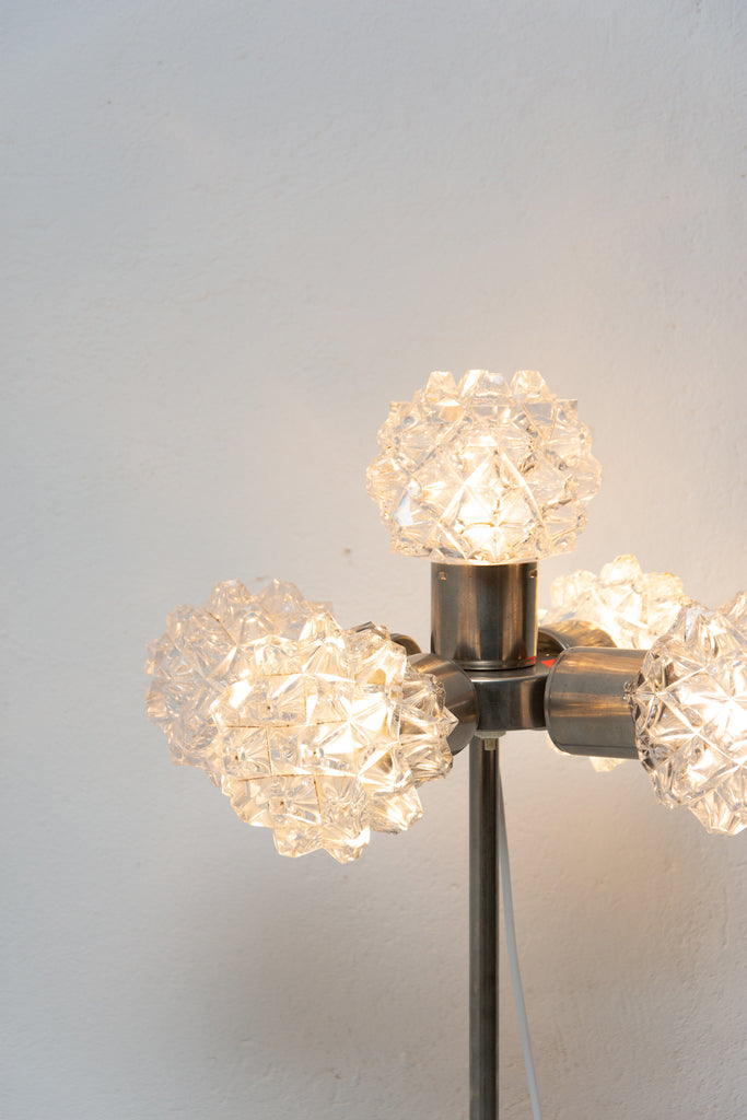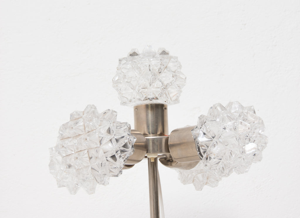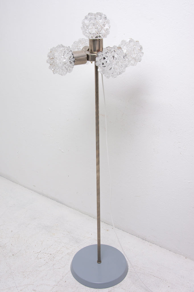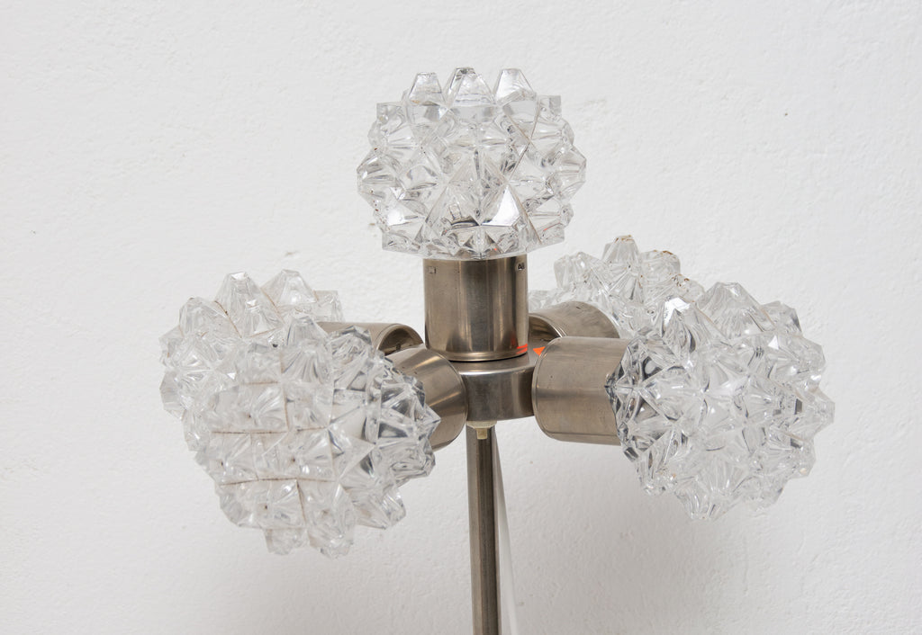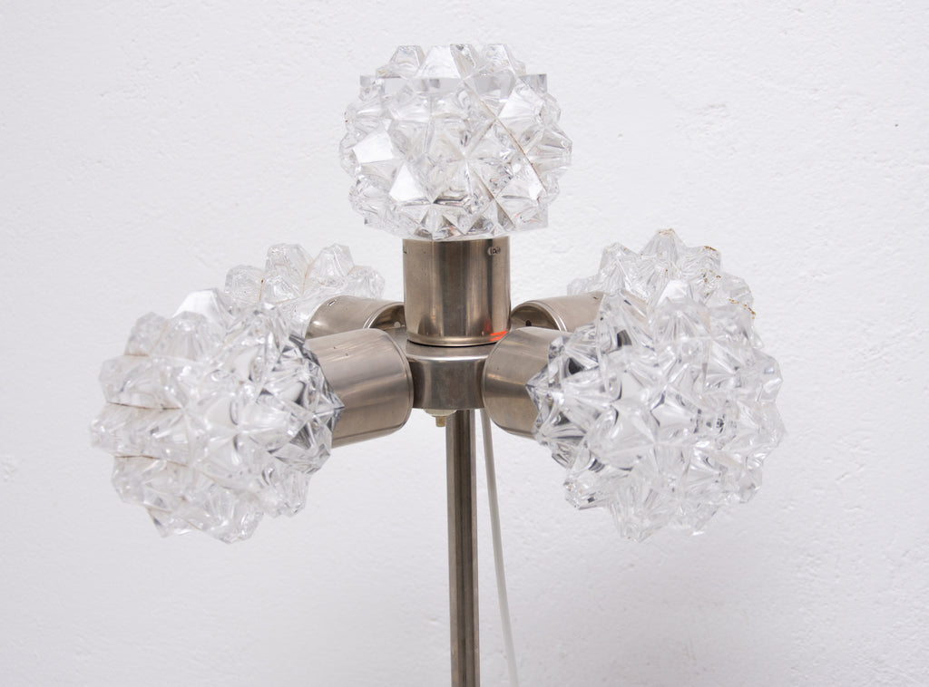 Lampadaire tchécoslovaque en verre taillé et plaqué chrome, fabriqué en ex-Tchécoslovaquie par la société Kamenický senov dans les années 1970. Il est doté d'une structure en acier chromé et de cinq abat-jour en verre taillé. La lampe est en très bon état et entièrement fonctionnelle.