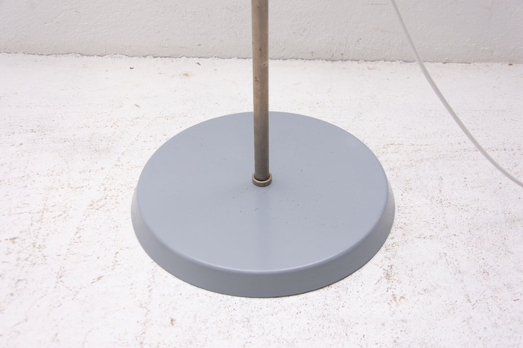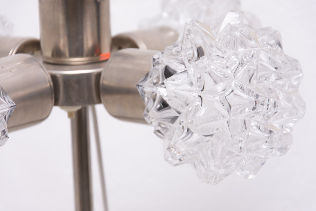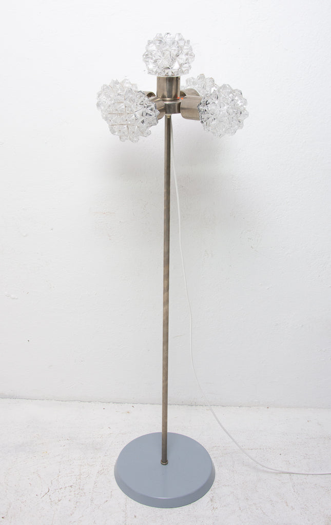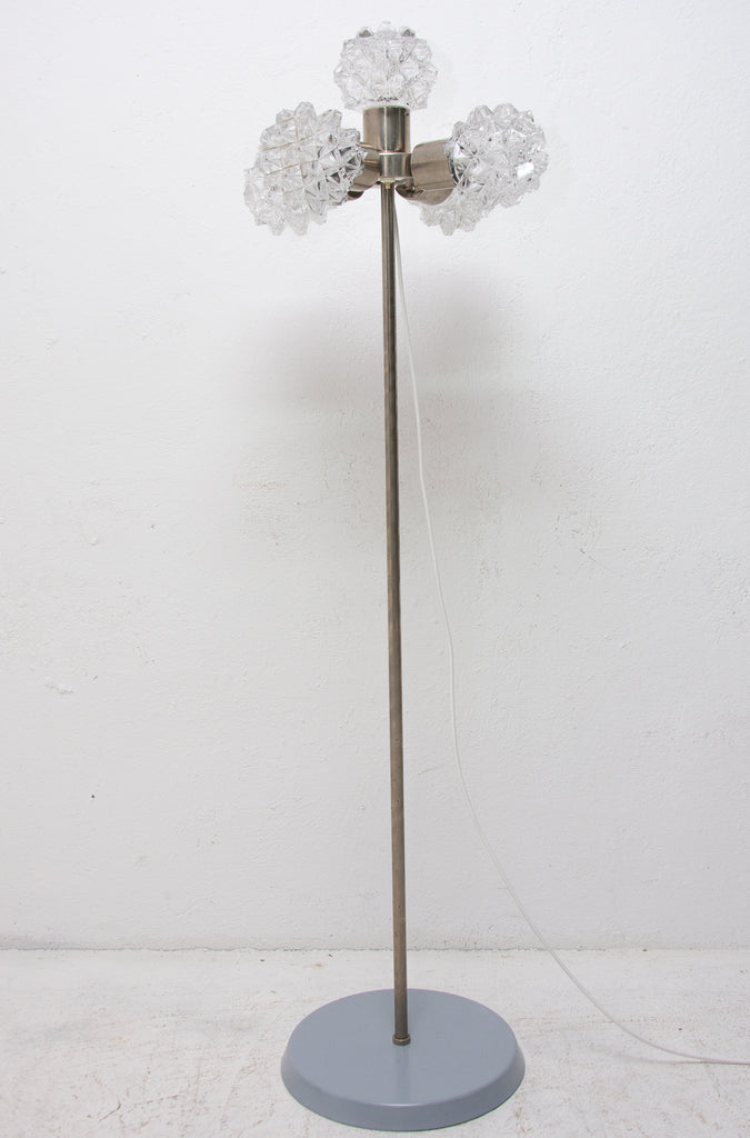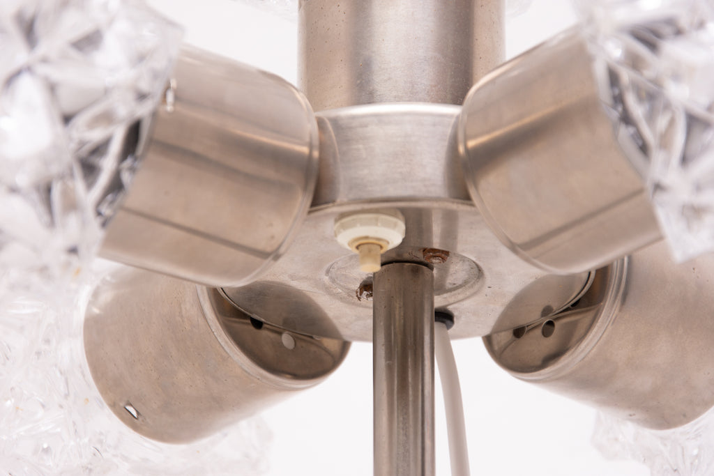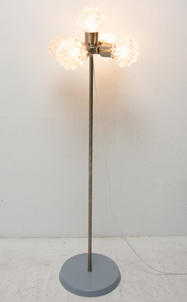 Lampadaire tchécoslovaque en verre taillé et plaqué chrome, fabriqué en ex-Tchécoslovaquie par la société Kamenický senov dans les années 1970. Il est doté d'une structure en acier chromé et de cinq abat-jour en verre taillé. La lampe est en très bon état et entièrement fonctionnelle.
