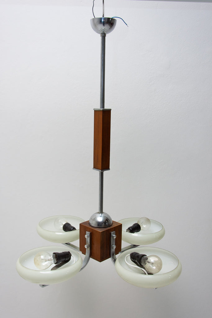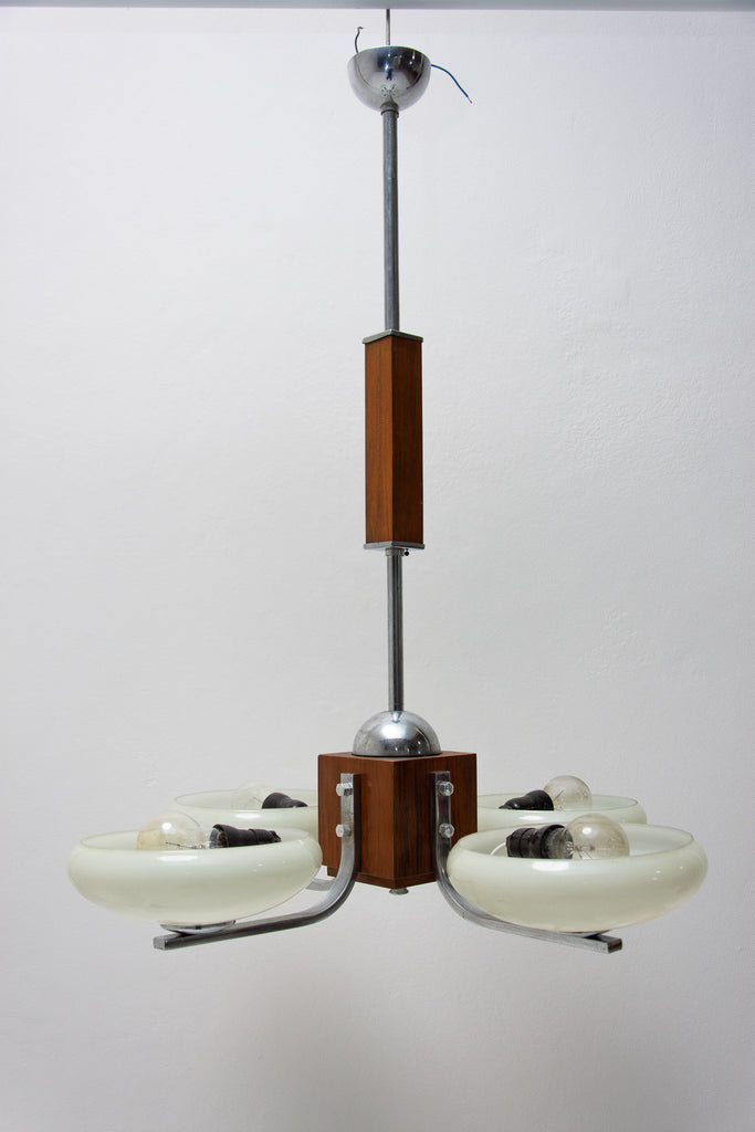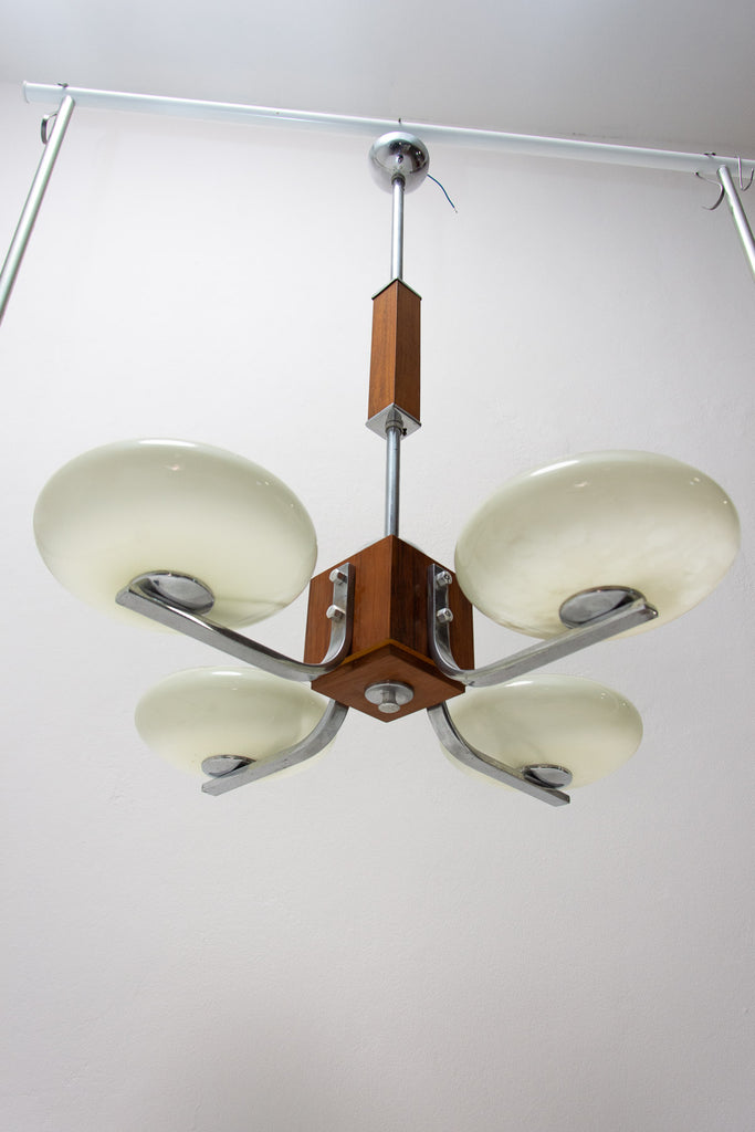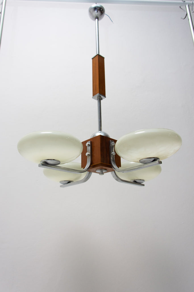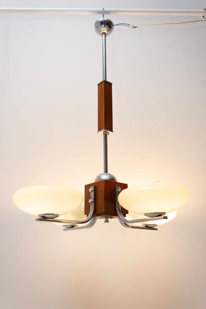 Ce magnifique lustre ART DÉCO a été fabriqué en Bohême dans les années 1930. Il se caractérise par une structure chromée et des bras chromés reliés par un élément en bois. Ces bras sont surmontés de quatre abat-jour en verre. Le lustre a été nettoyé et recâblé. Il est en très bon état, avec de légères traces de patine.