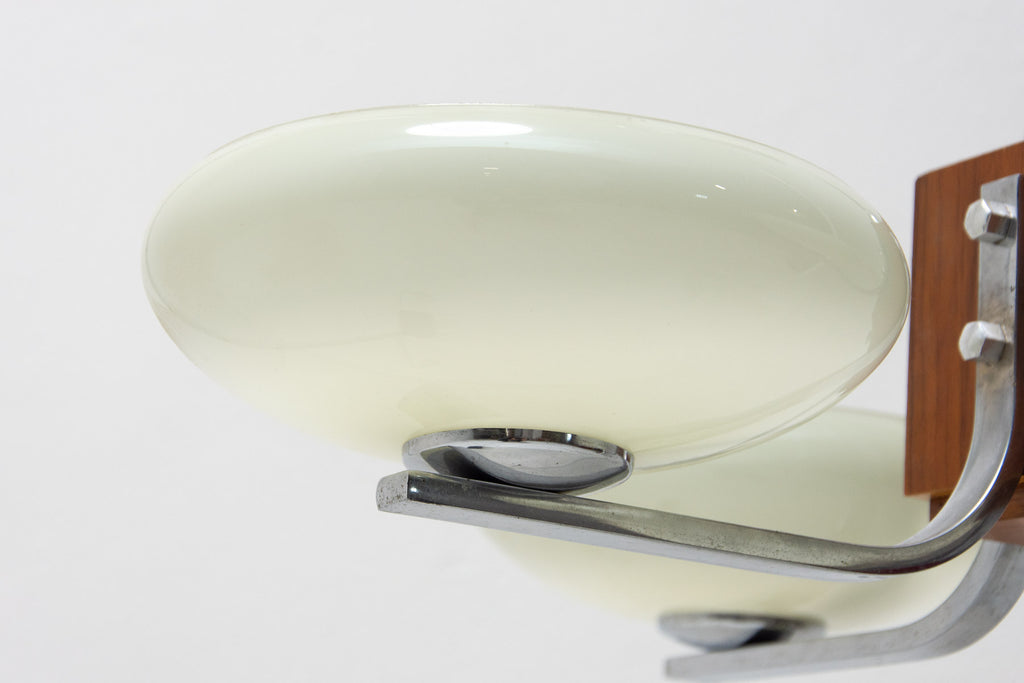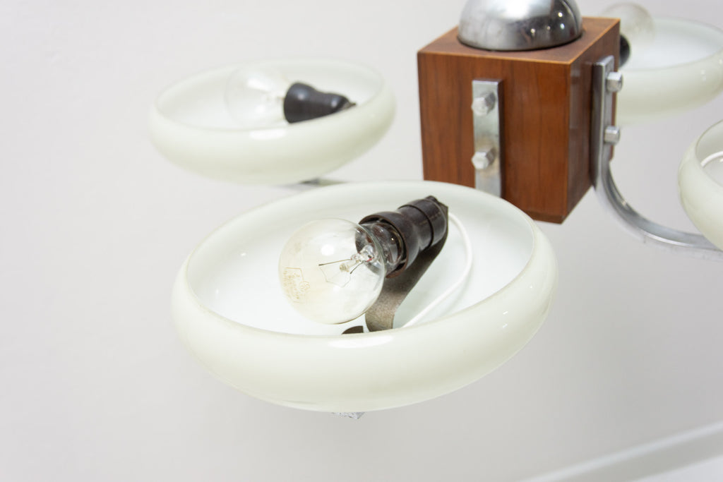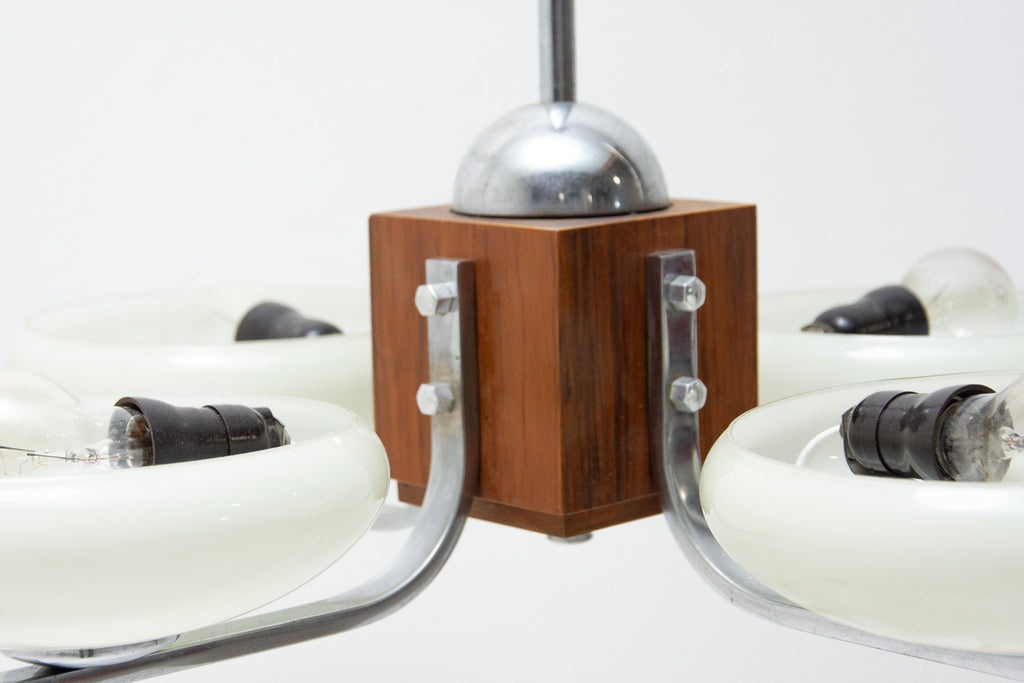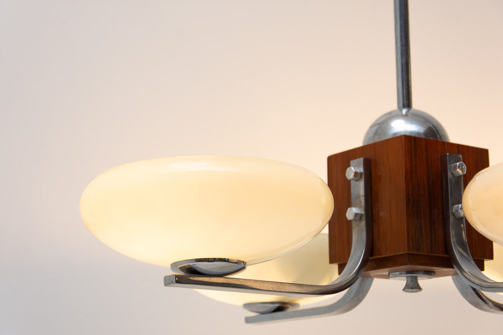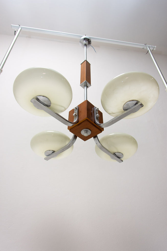 Ce magnifique lustre ART DÉCO a été fabriqué en Bohême dans les années 1930. Il se caractérise par une structure chromée et des bras chromés reliés par un élément en bois. Ces bras sont surmontés de quatre abat-jour en verre. Le lustre a été nettoyé et recâblé. Il est en très bon état, avec de légères traces de patine.