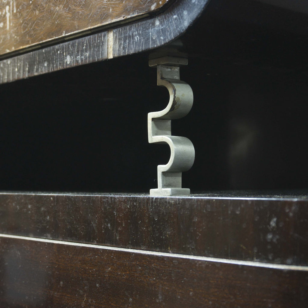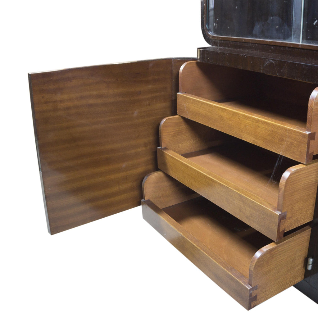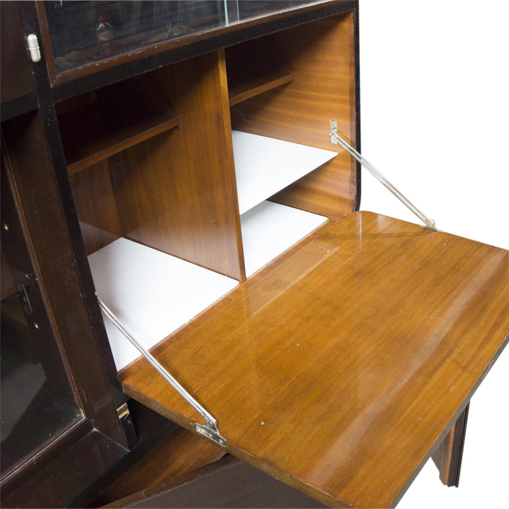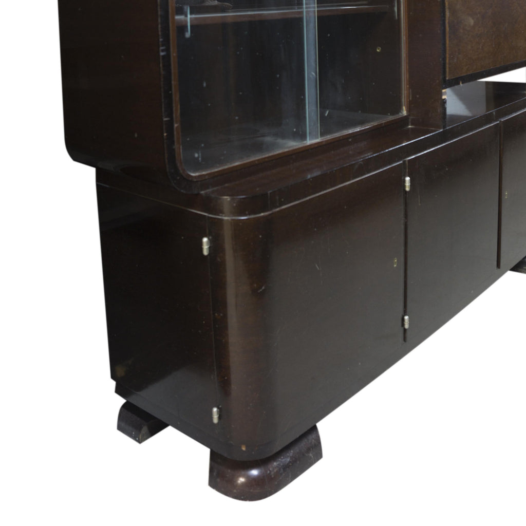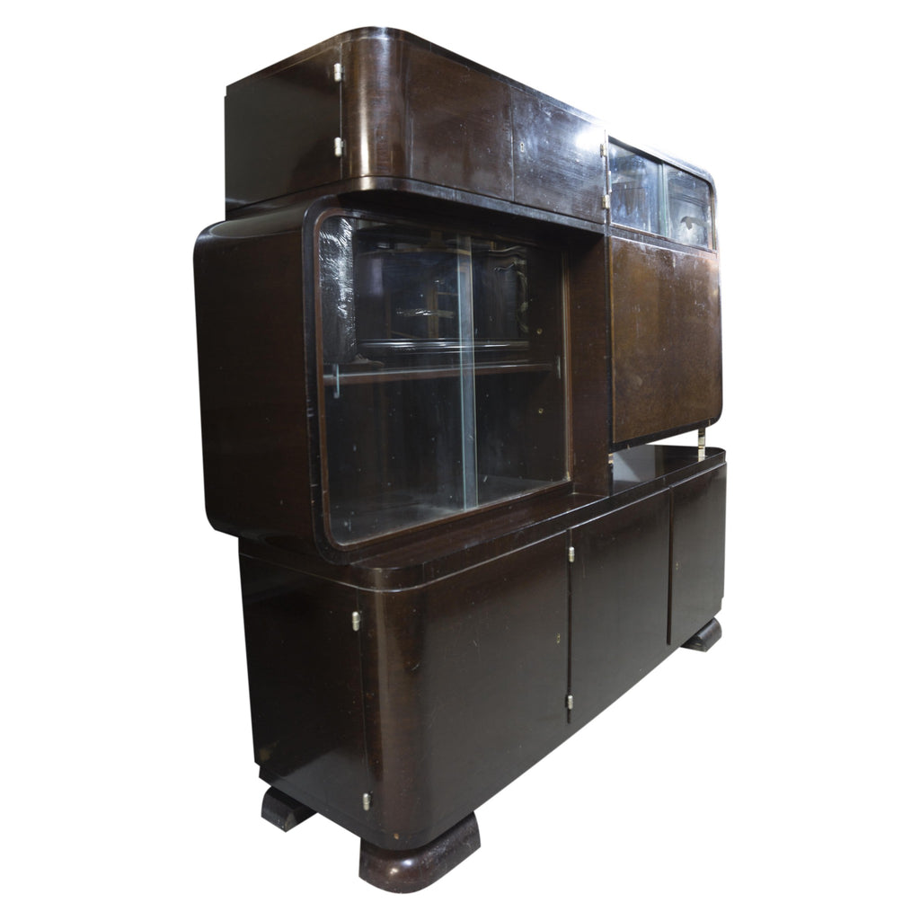 ART DECO SECRETARY, Bohemia, 1930´S. Manufactured in Bohemia 1930´s. Probably UP Závody. Timeless design. Polished high gloss design.Upper left door and upper glazed right part consists of a cabinet with shelves, lower left compartment has horizontal shelf wood bars. Lower section in the center has 2 doors, inside are drawers. Above the drawers is a display section with two sliding glass doors and right side has compartment with bar. There is also secret compartment drawer. Steel structure supports middle part. Walnut and elm veneer. Solid wood. In good Vintage condition.
