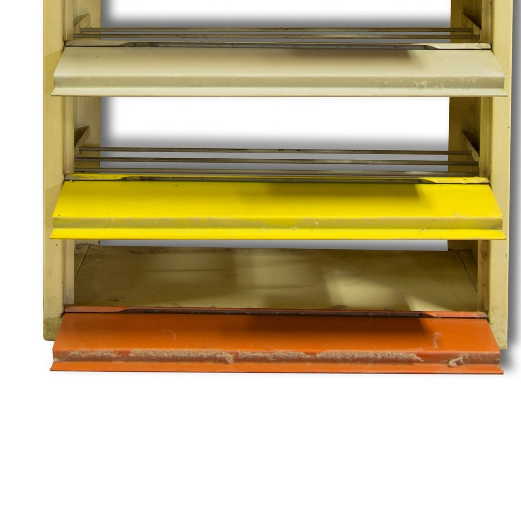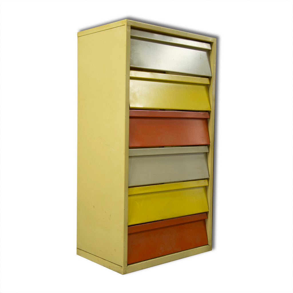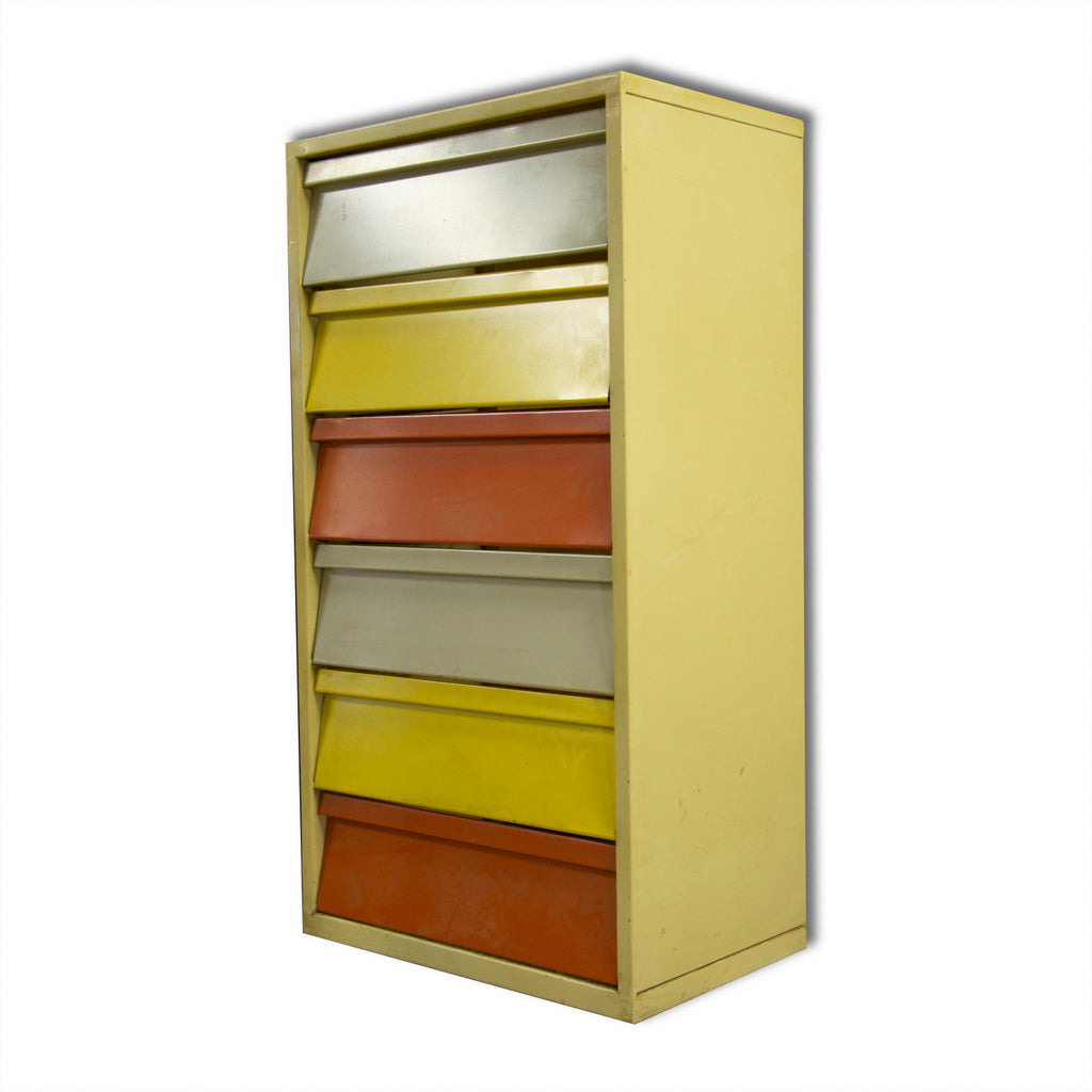 Vintage colour sheet metal shoe rack, Eastern bloc, 6 pull-out shelves, iron rods for the shoes inside, original paint, bears signs of age and wear, but generally in very good Vintage condition. Made in Czechoslovakia, 1960´s