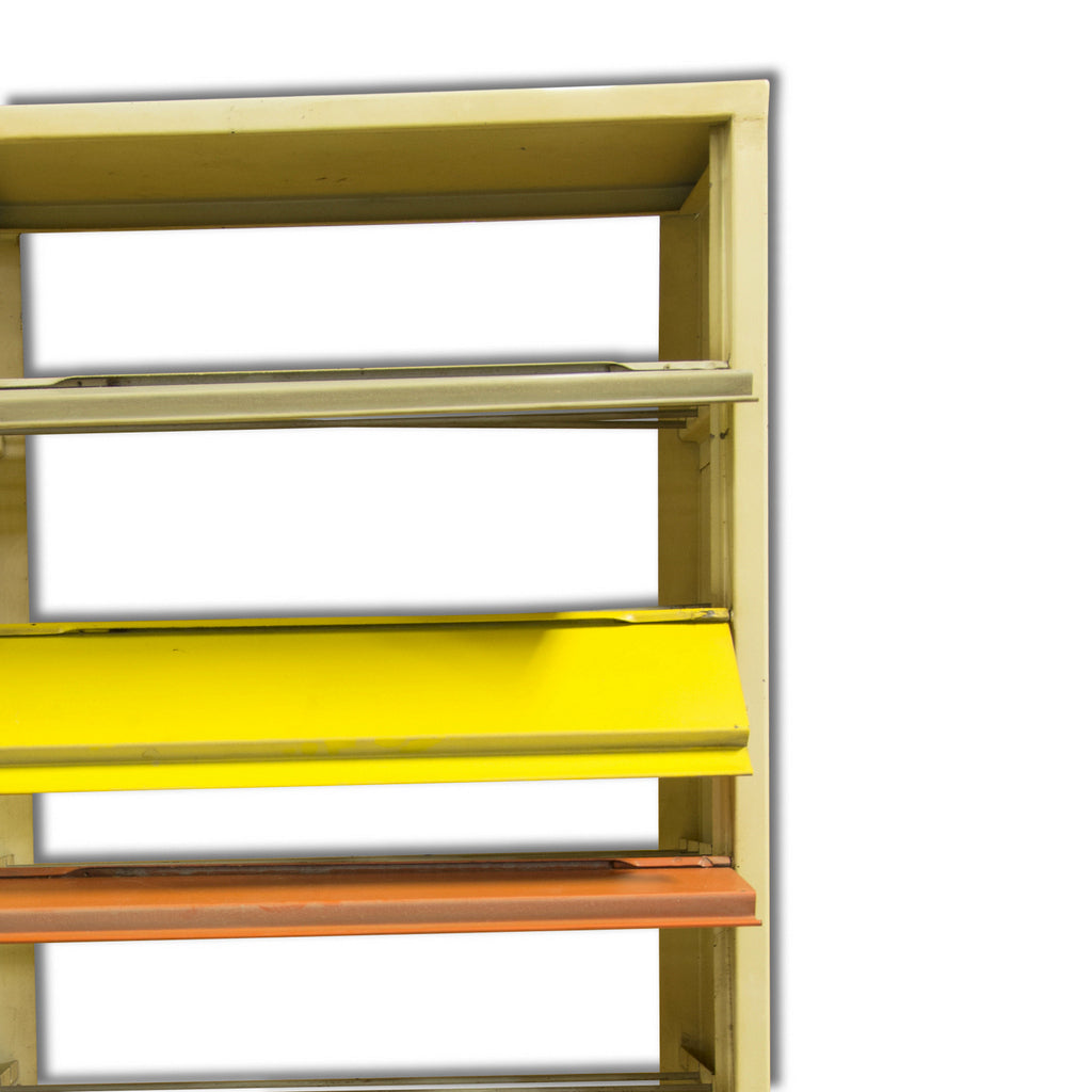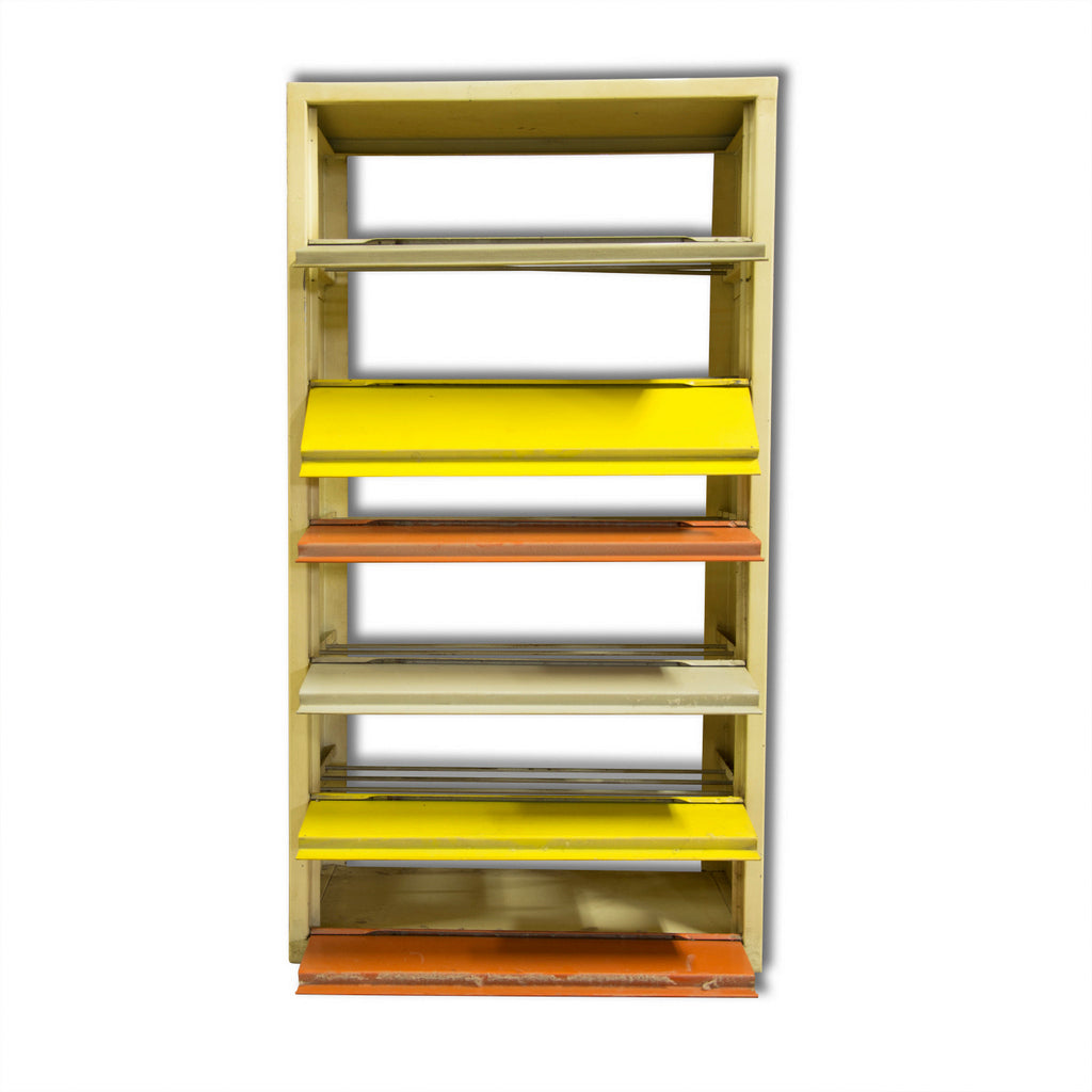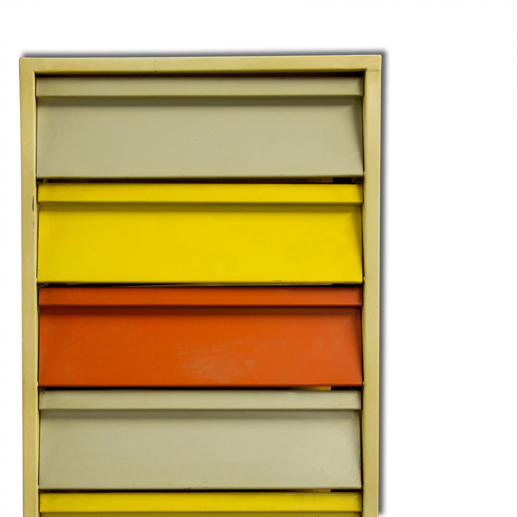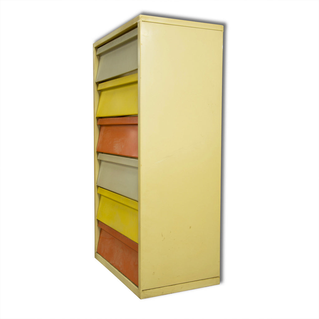 Vintage colour sheet metal shoe rack, Eastern bloc, 6 pull-out shelves, iron rods for the shoes inside, original paint, bears signs of age and wear, but generally in very good Vintage condition. Made in Czechoslovakia, 1960´s