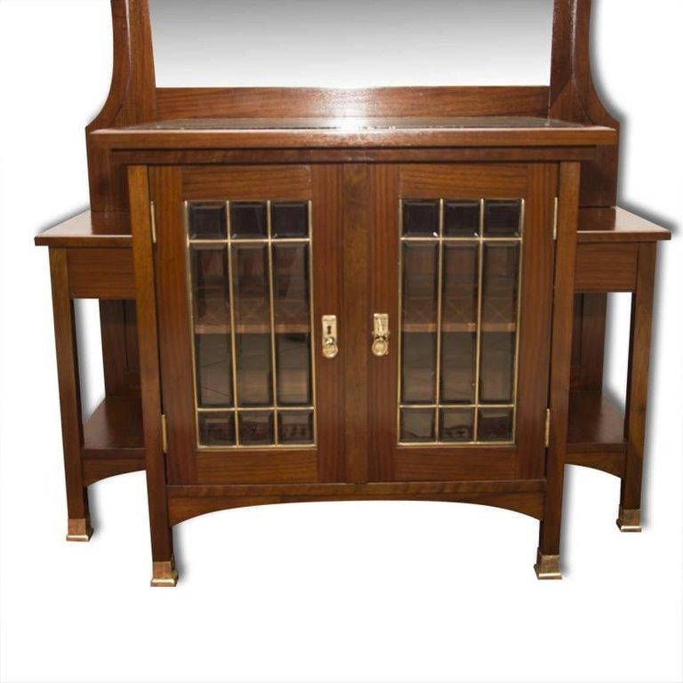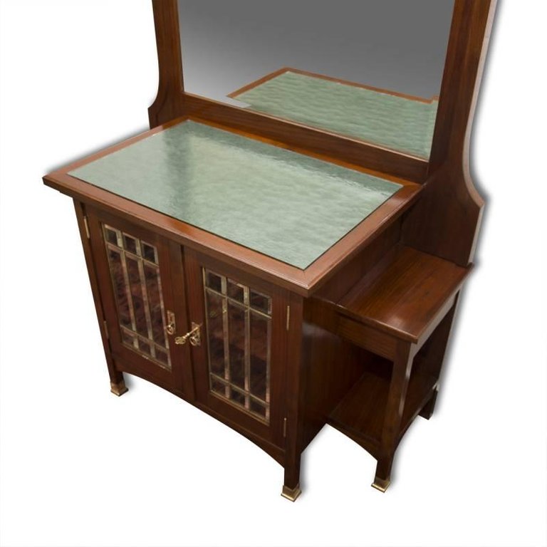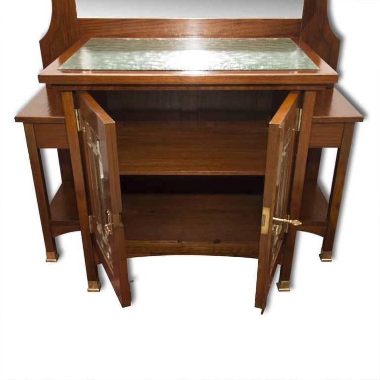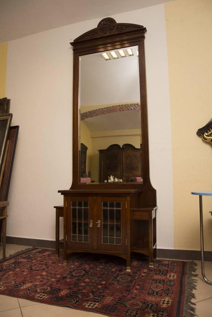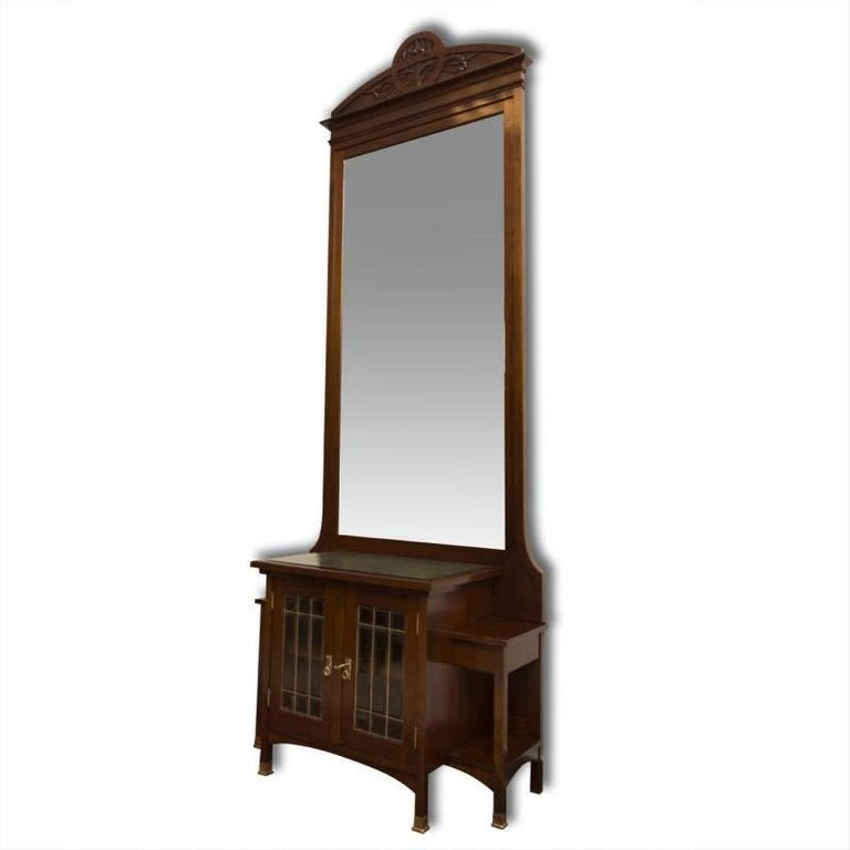 A large mirror with storage space from the Vienna Secession period. The mirror features geometric elements and shapes typical of Viennese Art Nouveau. It was manufactured in Austria-Hungary at the beginning of the 20th century. It is made of wood with a mahogany veneer, has faceted glass, and the original brass fittings including brass leg ends. The table plate is covered with a glass plate underneath of which is a fabric substrate. The mirror has been professionally renovated.