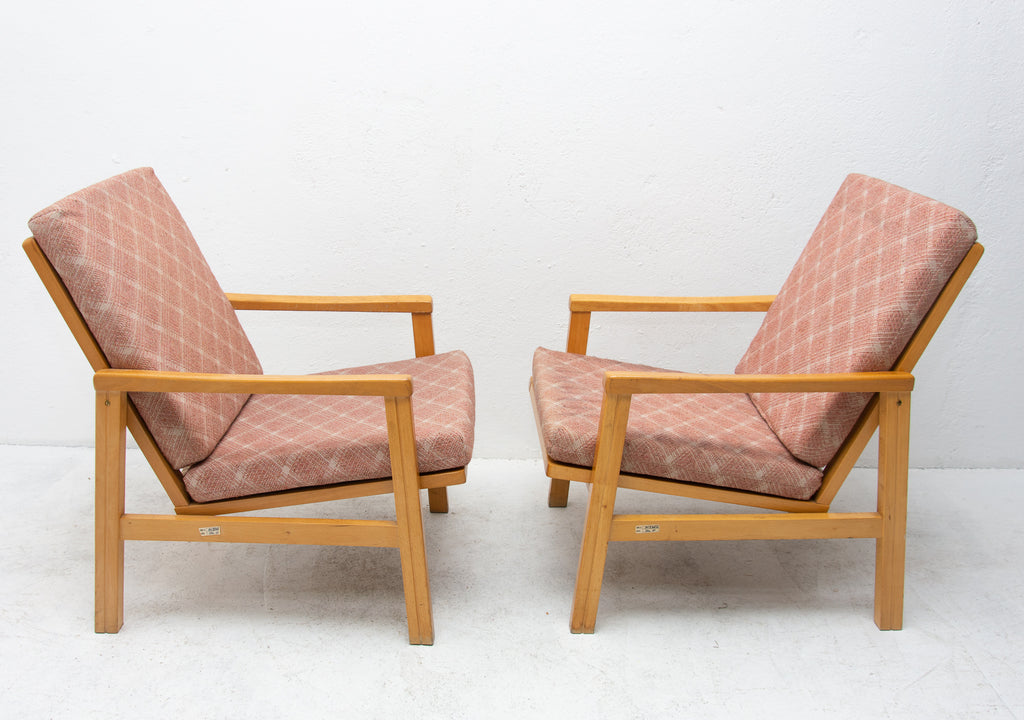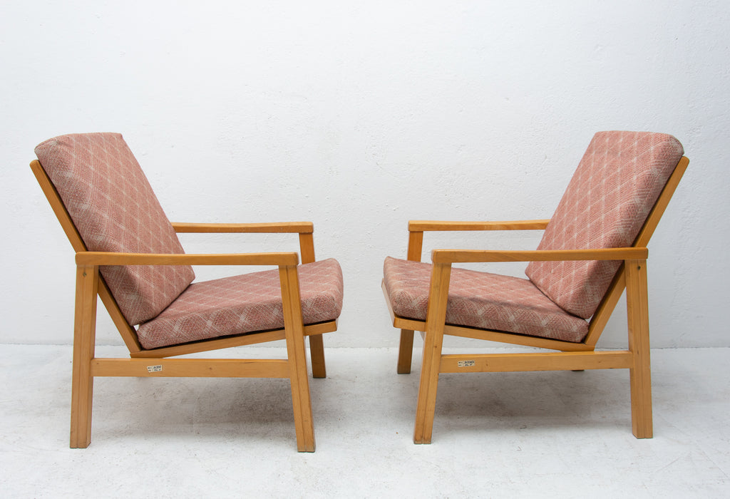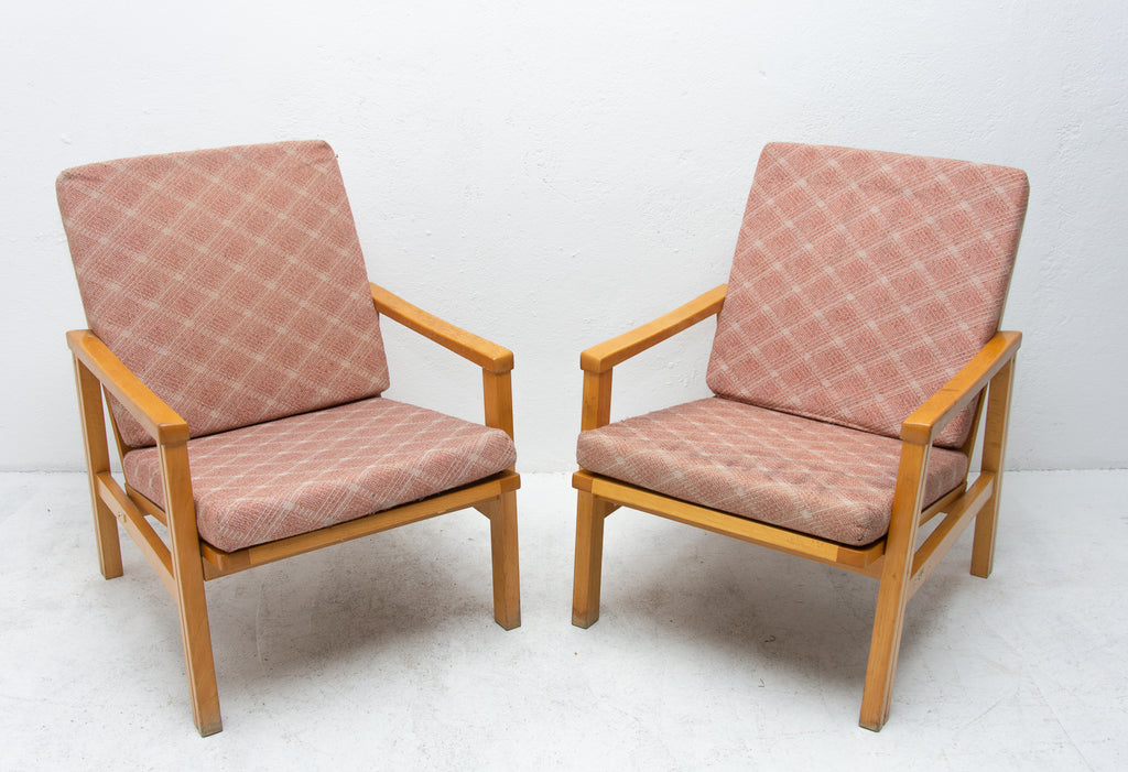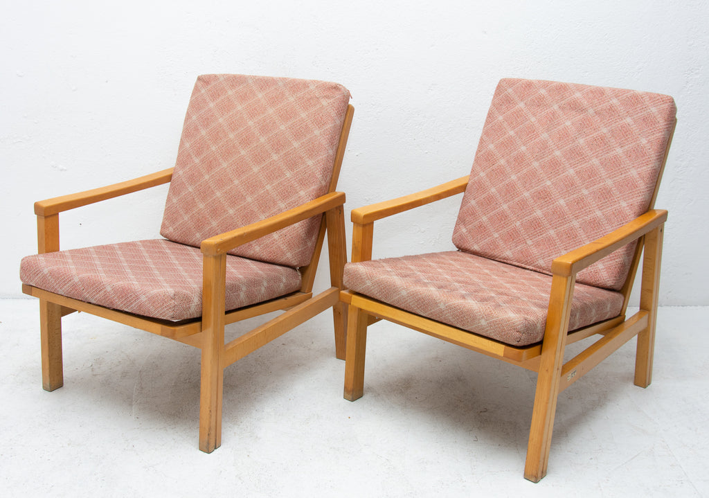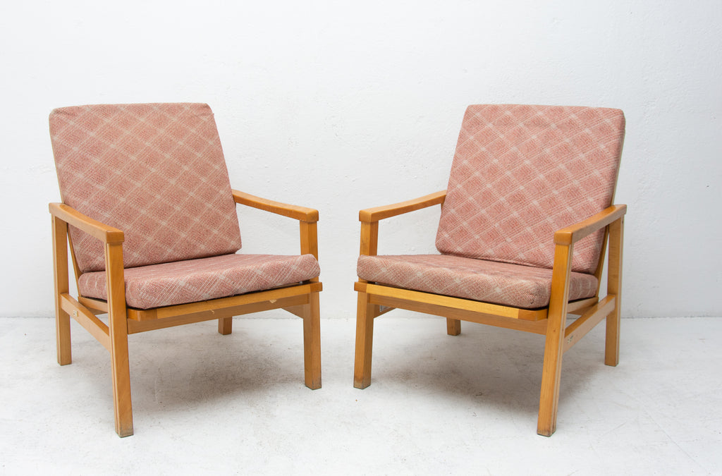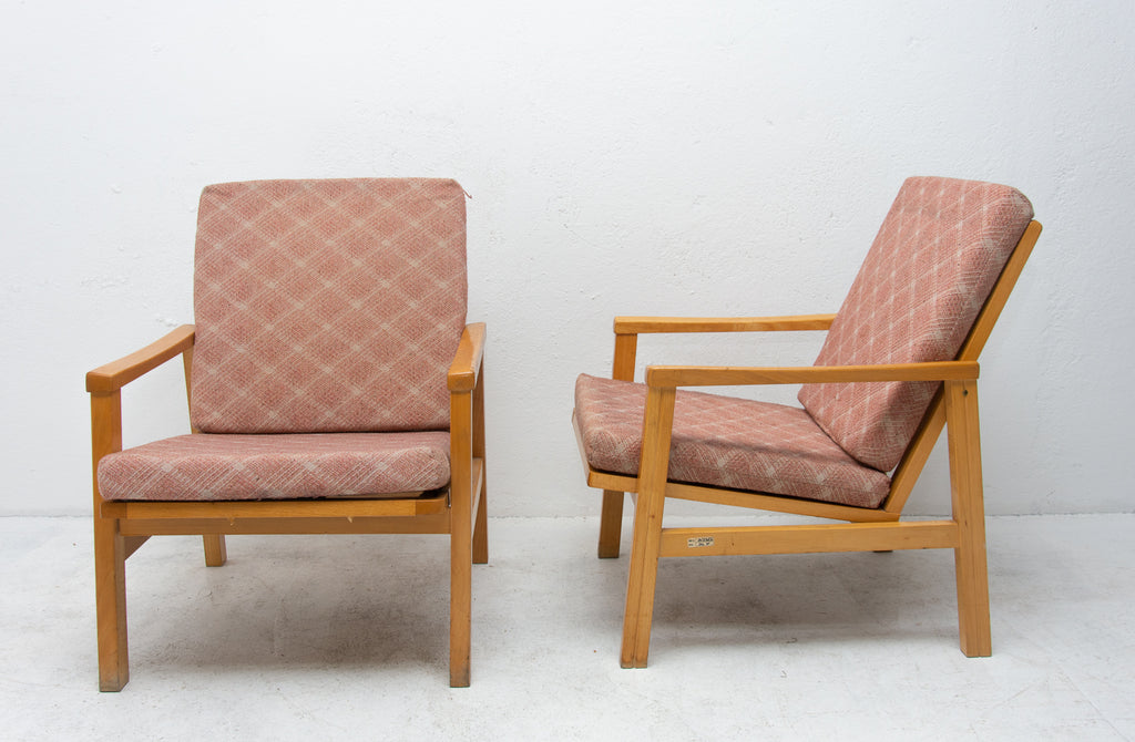 A pair of armchairs in Danish style, made in the former Czechoslovakia in the 1970´s . The chairs were produced by TON Bystřice pod Hostýnem company( Thonet successor in Czechoslovakia) The structure is made of beech wood and the chairs has original upholstery. The chairs are in very good Vintage condition, bears slight signs of age and using. Price is for the pair
