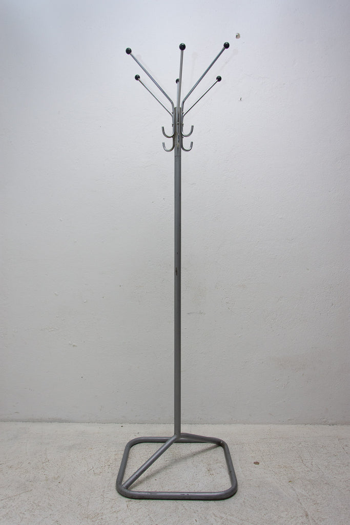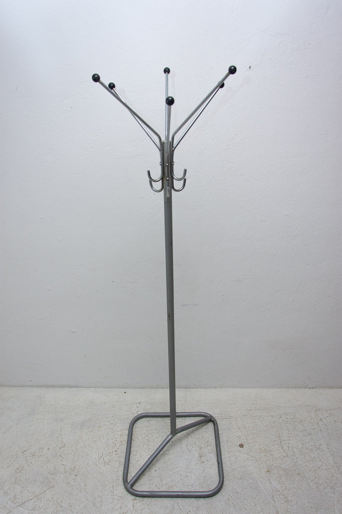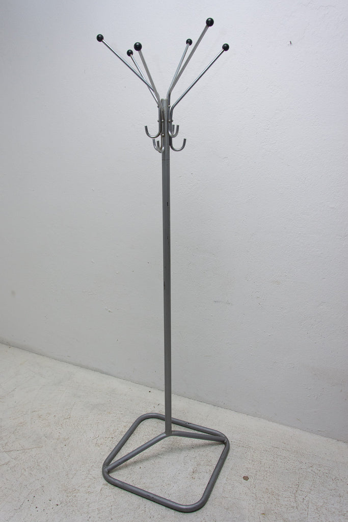 For all Bauhaus lovers! A beautiful example of Bohemian pre-war functionalism represents this model of coat rack. This hanger was designed probably by Gottwald or Slezák company in Bohemia in the 1930s and produced in the 1950´s. It features a full-chrome structure with round wooden tips at the ends and umbrella holder. The rod is painted grey.