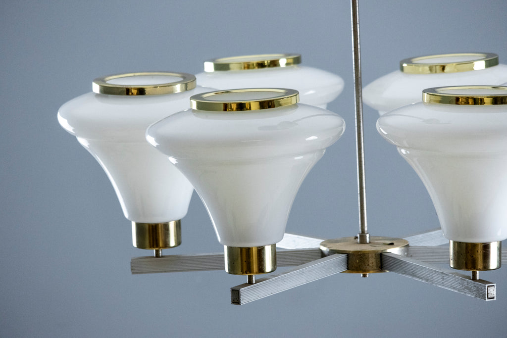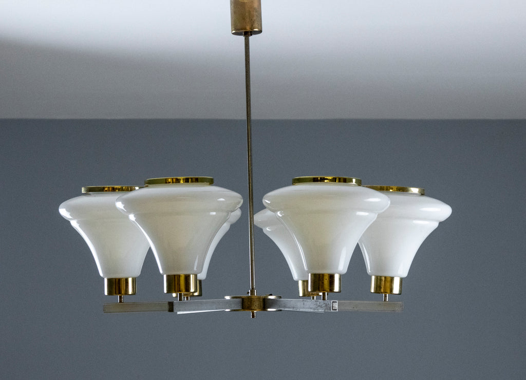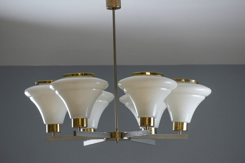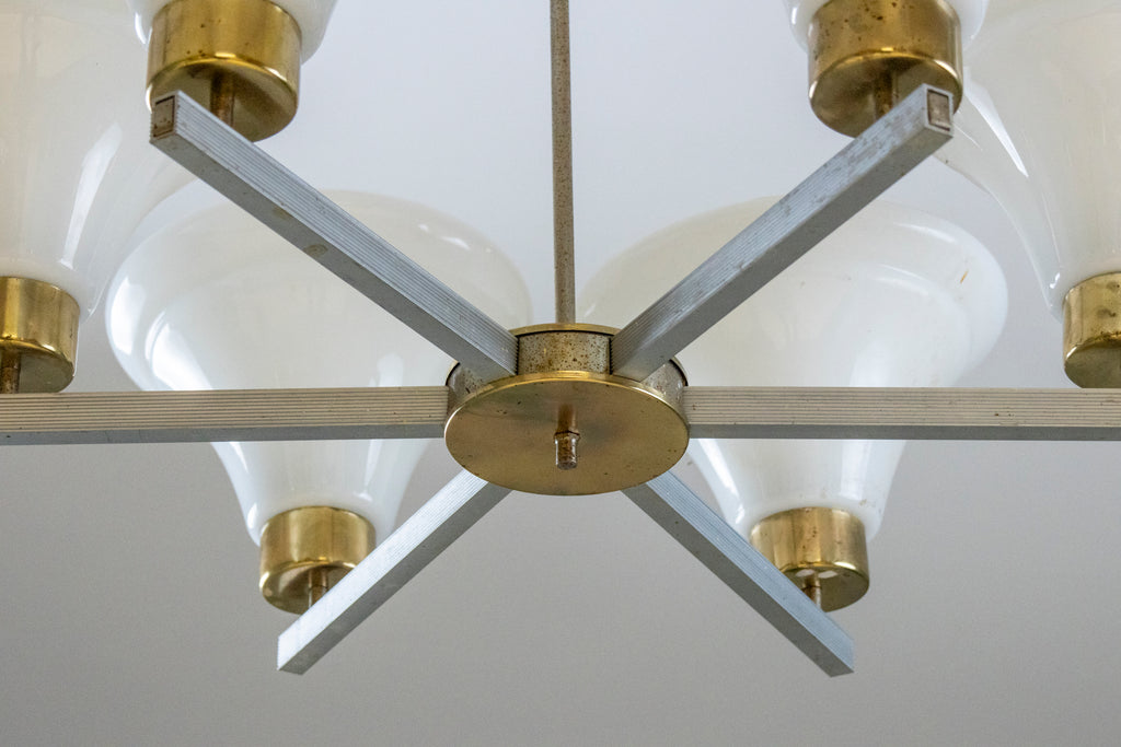 The fixture features six flared opaline glass shades mounted on a brass and metal structure, suspended from a central rod. The minimalist geometry and warm brass tones evoke mid-century sophistication while diffusing light with a soft, atmospheric glow.