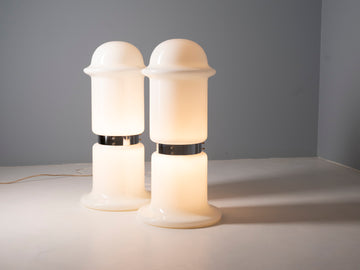 The lamp is made entirely of triplex opal glass with a metal base, producing a soft, evenly diffused light. It remains in excellent, undamaged vintage condition, preserving both its functionality and aesthetic integrity.