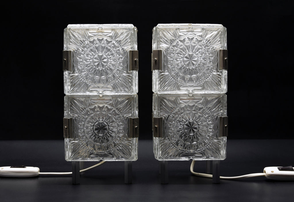 Designed by Jaroslav Beyvl Sr. for Lustry n.p. Preciosa, Kamenický Šenov, and produced in cooperation with Osvětlovací sklo, Valašské Meziříčí, this glass cube table lamp represents a refined example of Czechoslovak lighting design from the 1970s.