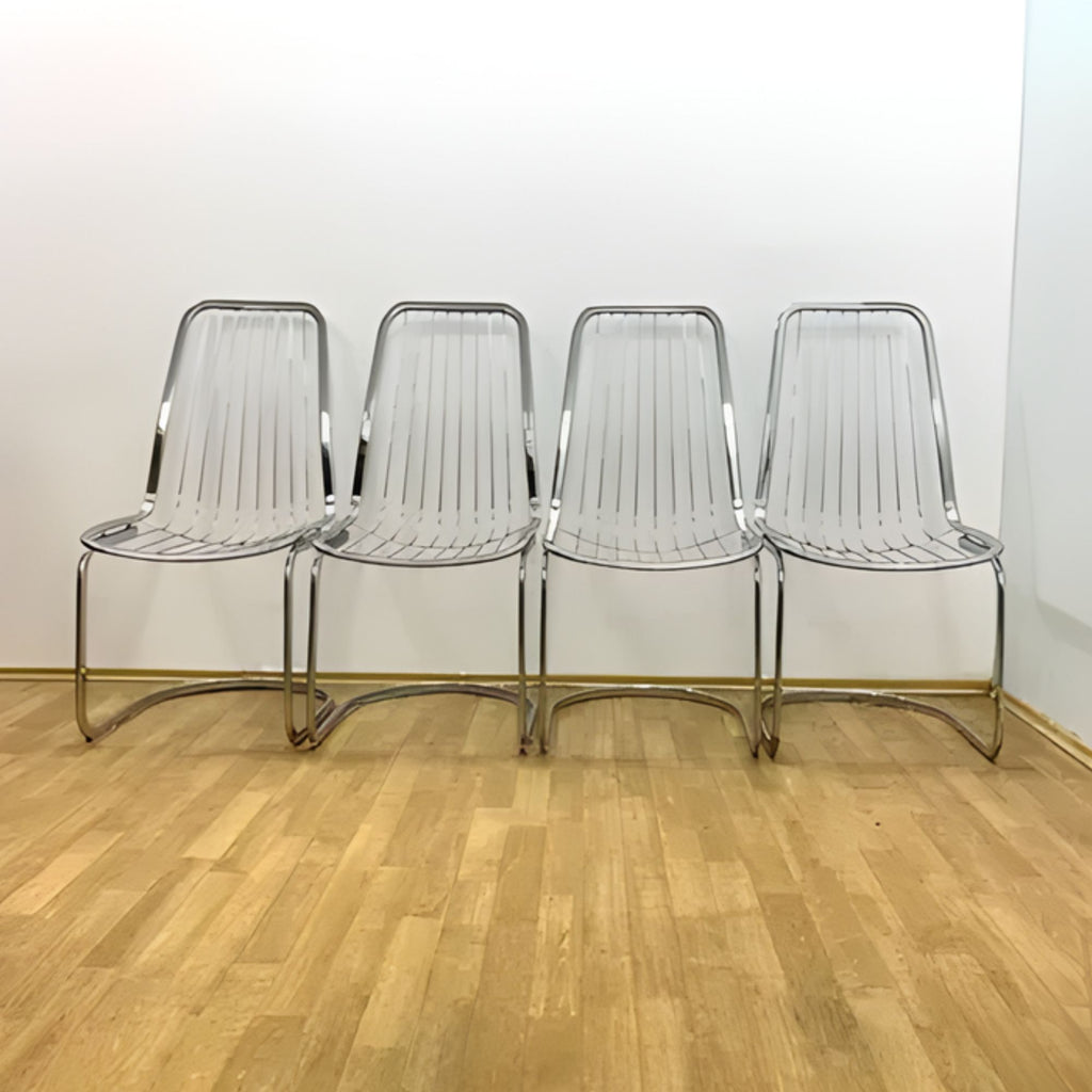 All four chairs are in exceptionally well-preserved original condition, with only minimal wear consistent with age. The construction is stable, the chrome has a bright finish, and the upholstery can be easily refreshed if desired. The set is ready to be placed directly into any vintage, or design-focused interior.